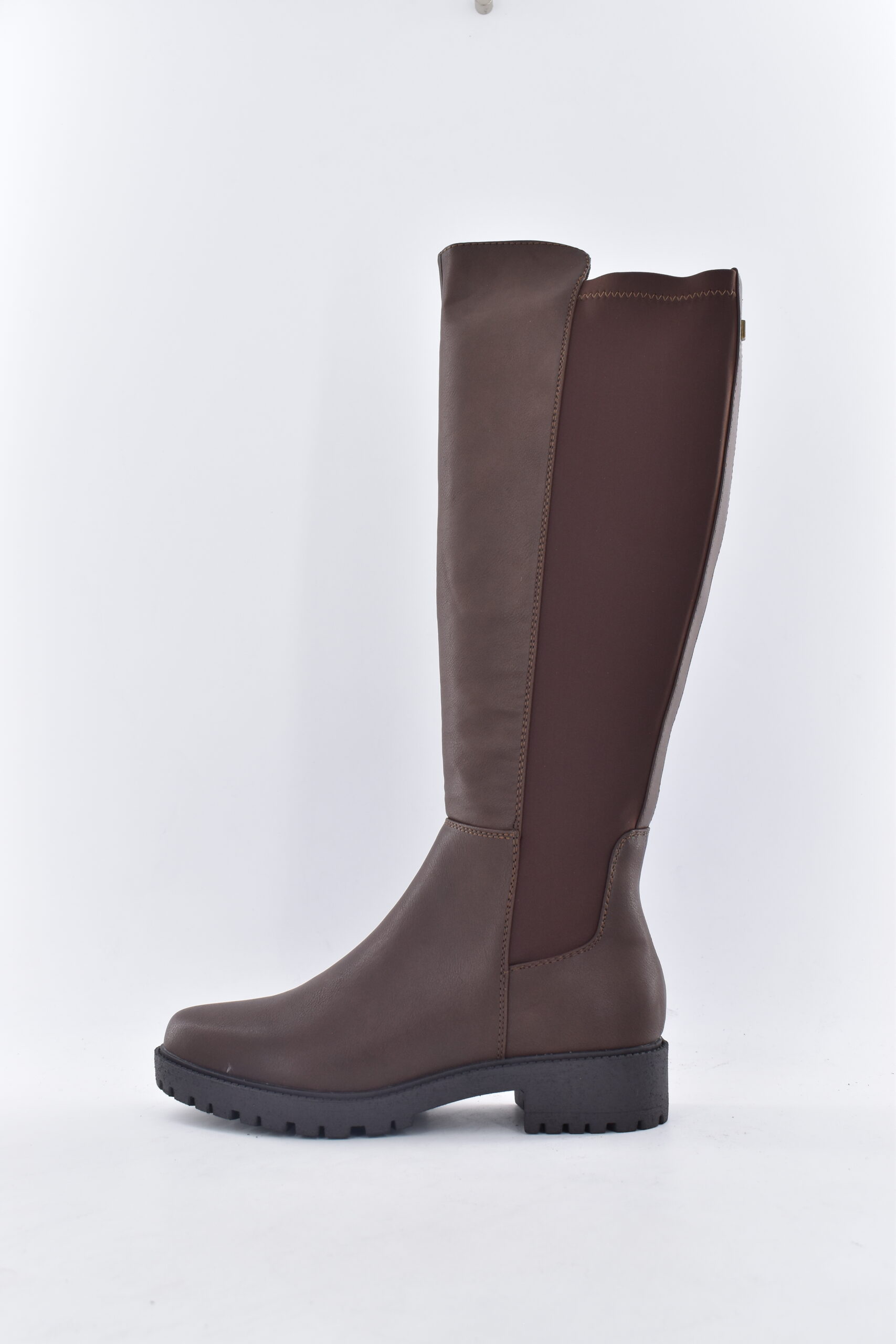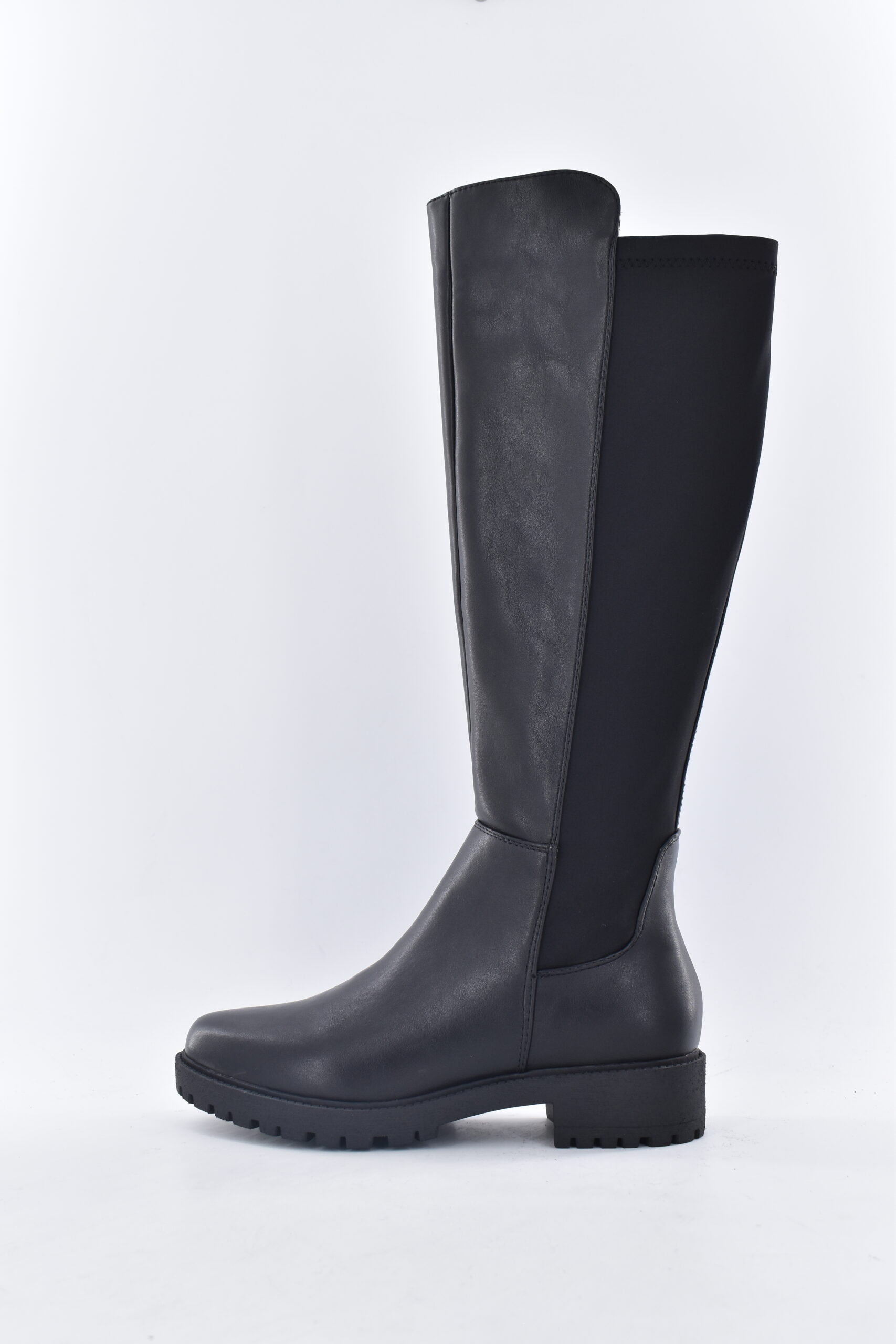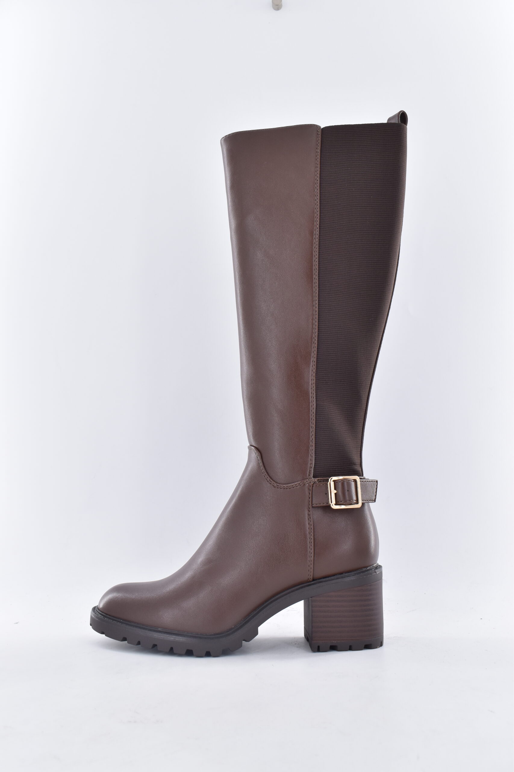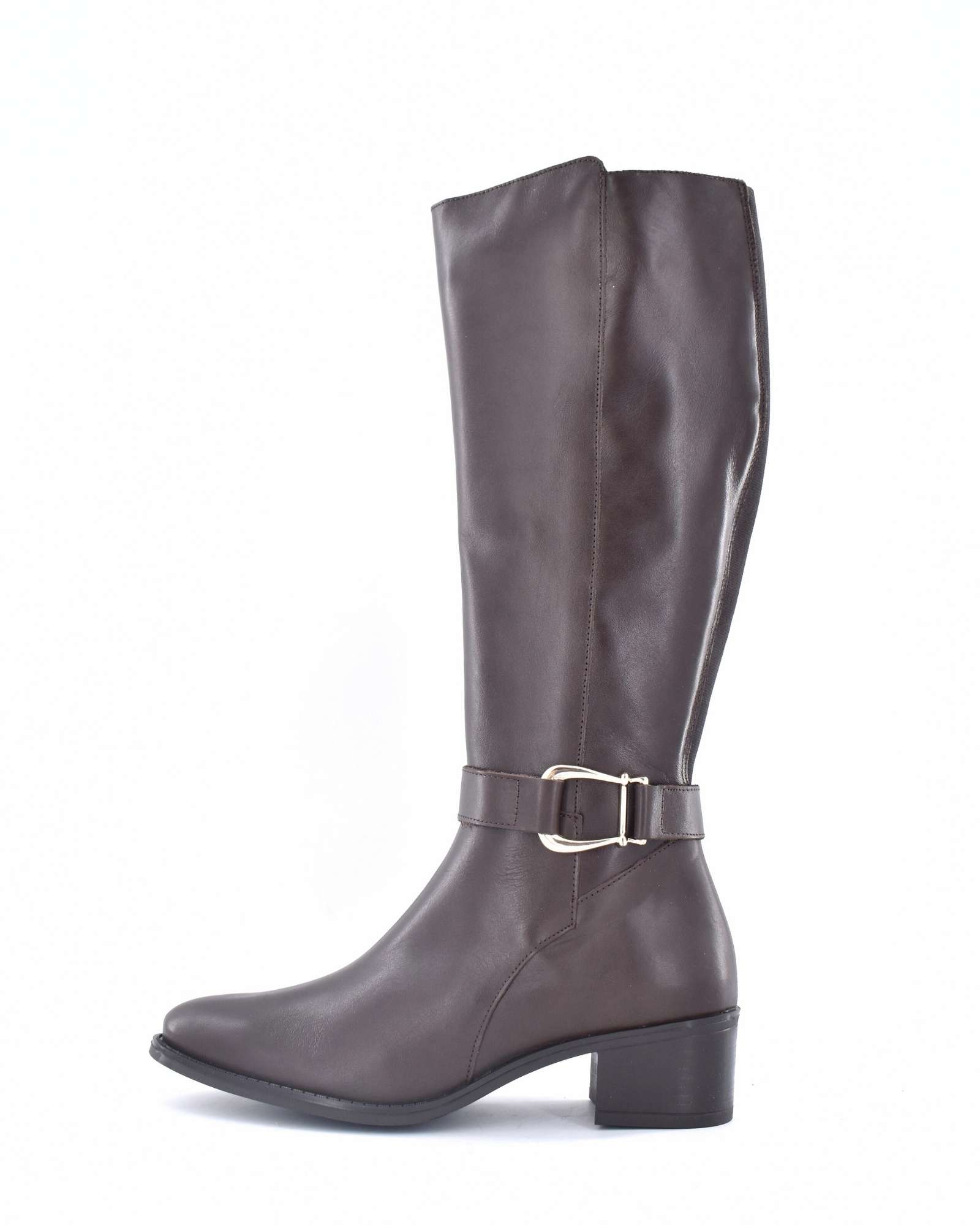 Bota en piel de caña alta con elástico en la parte trasera con piso de cuero con un tacón entre 1 cm y 3 cm