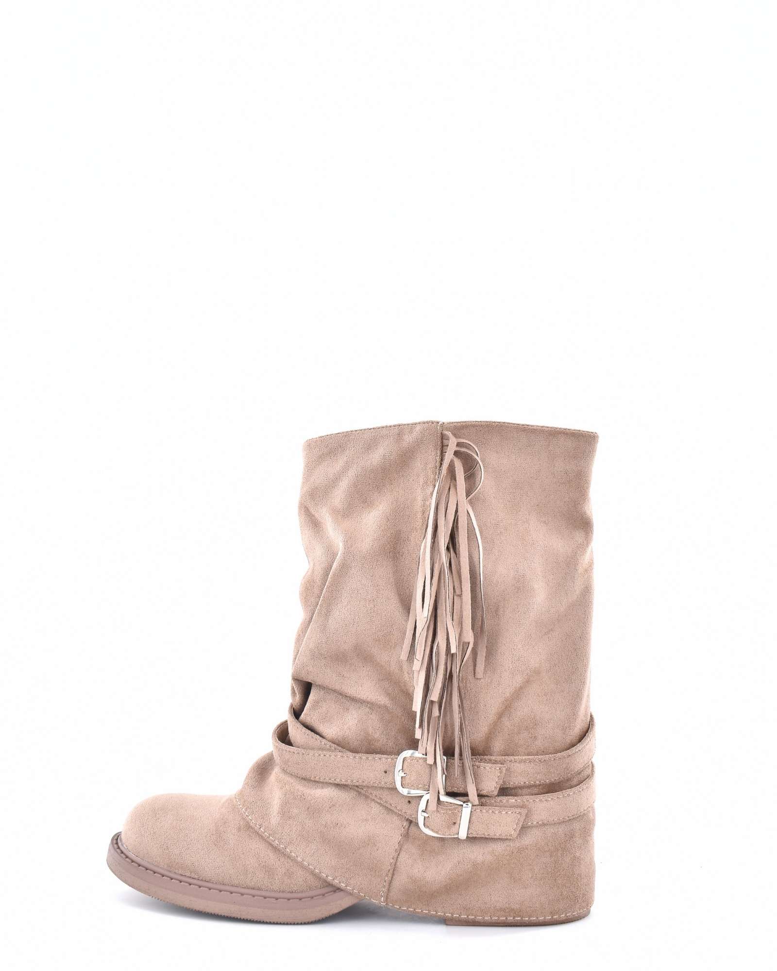 Botin con caña «plegada» con cremallera y detalle de flecos y hebilla con suela de goma antideslizante y con un tacón de entre 3 y 4 centímetros