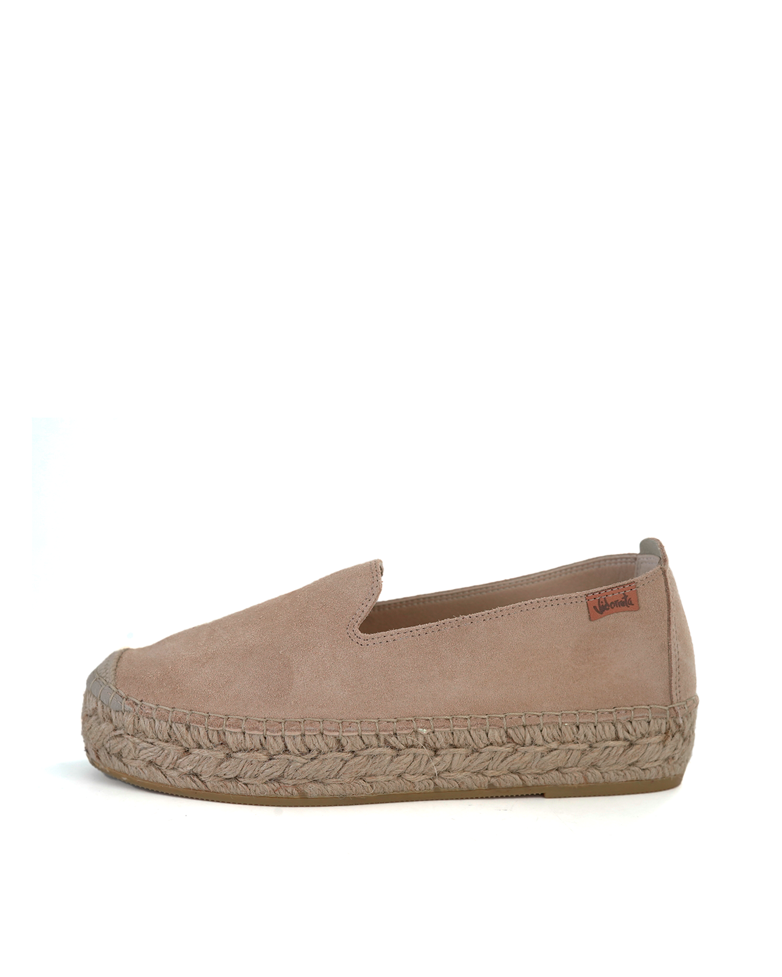 Alpargata de ante cruzada y abierta en parte delantera con plataforma de 9 cm en parte trasera y 2,5 cm en parte delantera.Destaca por su color lino viejo.