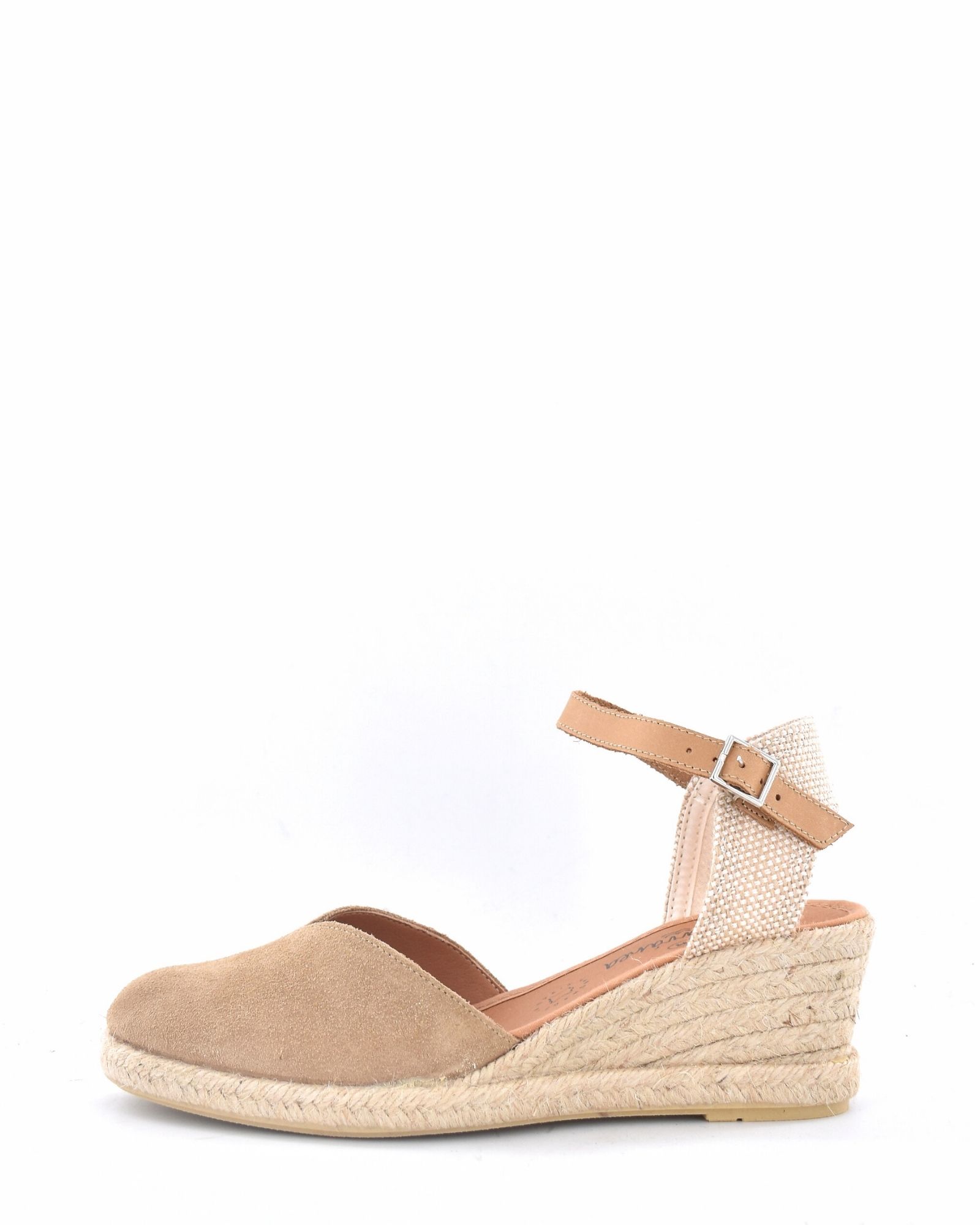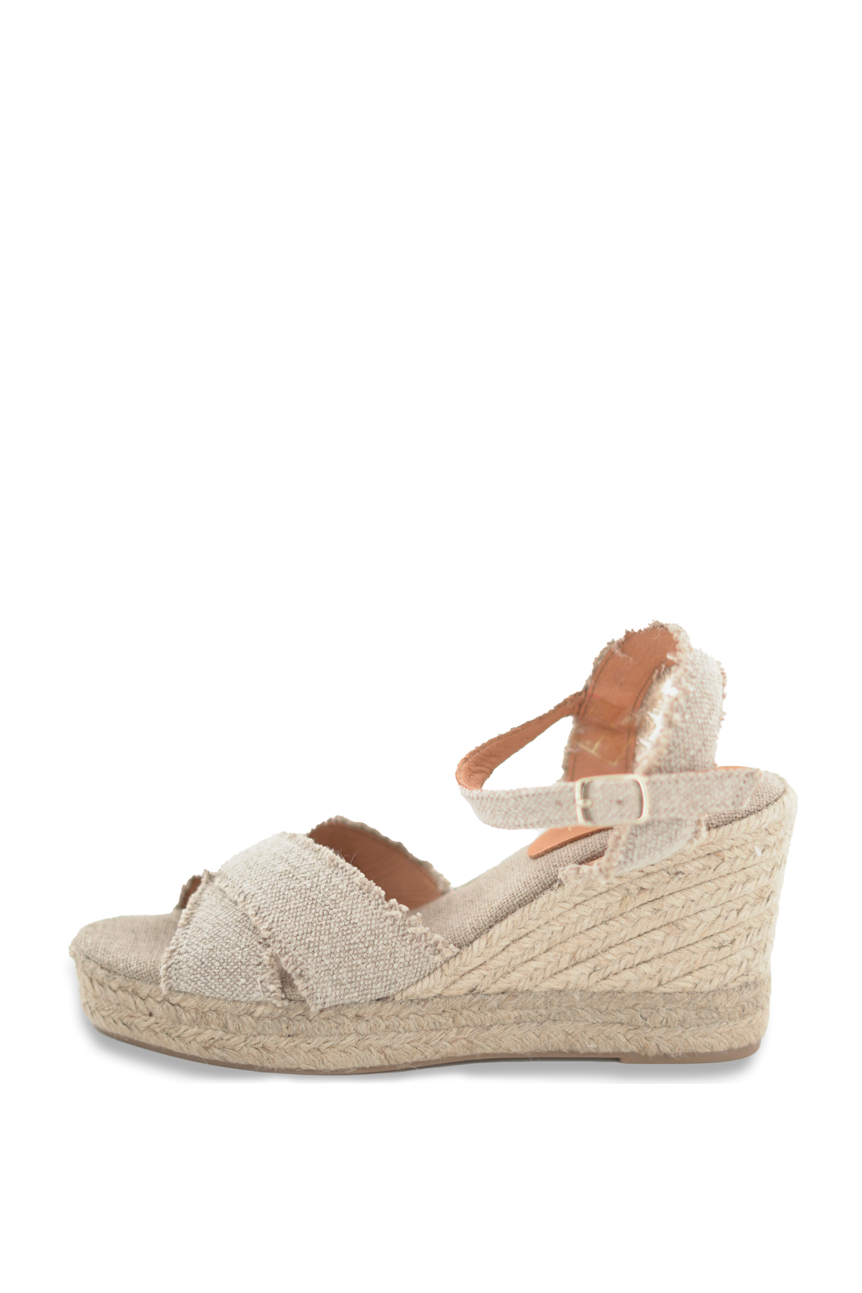 Alpargata de ante cruzada y abierta en parte delantera con plataforma de 9 cm en parte trasera y 2,5 cm en parte delantera.Destaca por su color lino viejo.