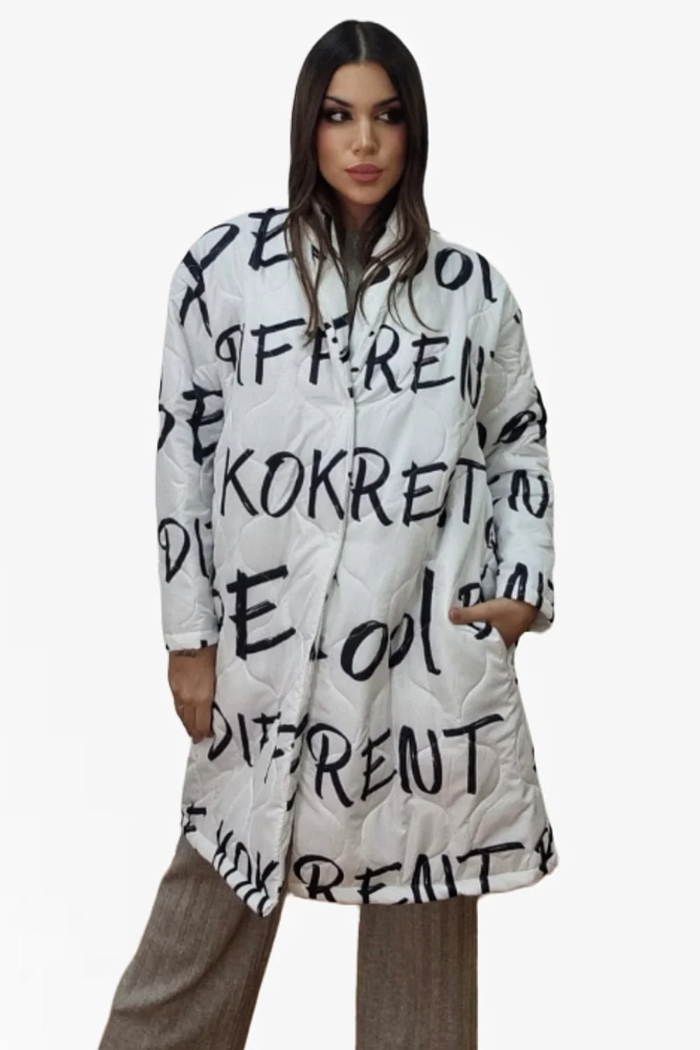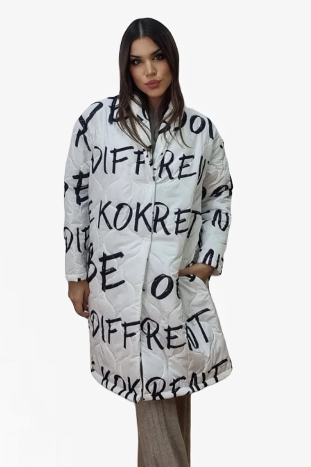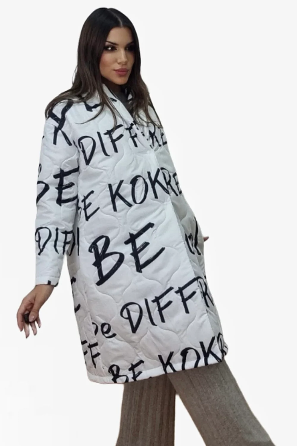 Abrigo acolchado tres cuartos con estampado be cool, be different, be koker.