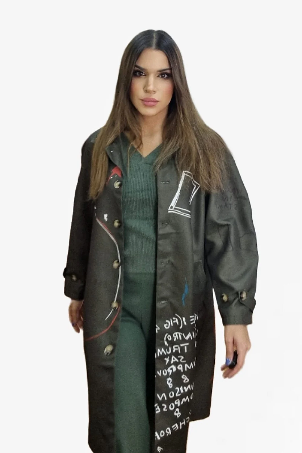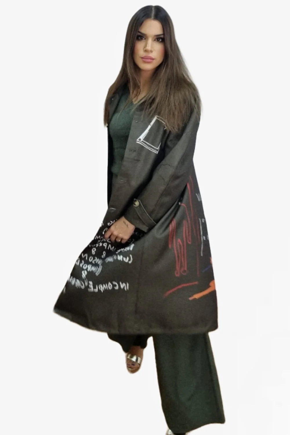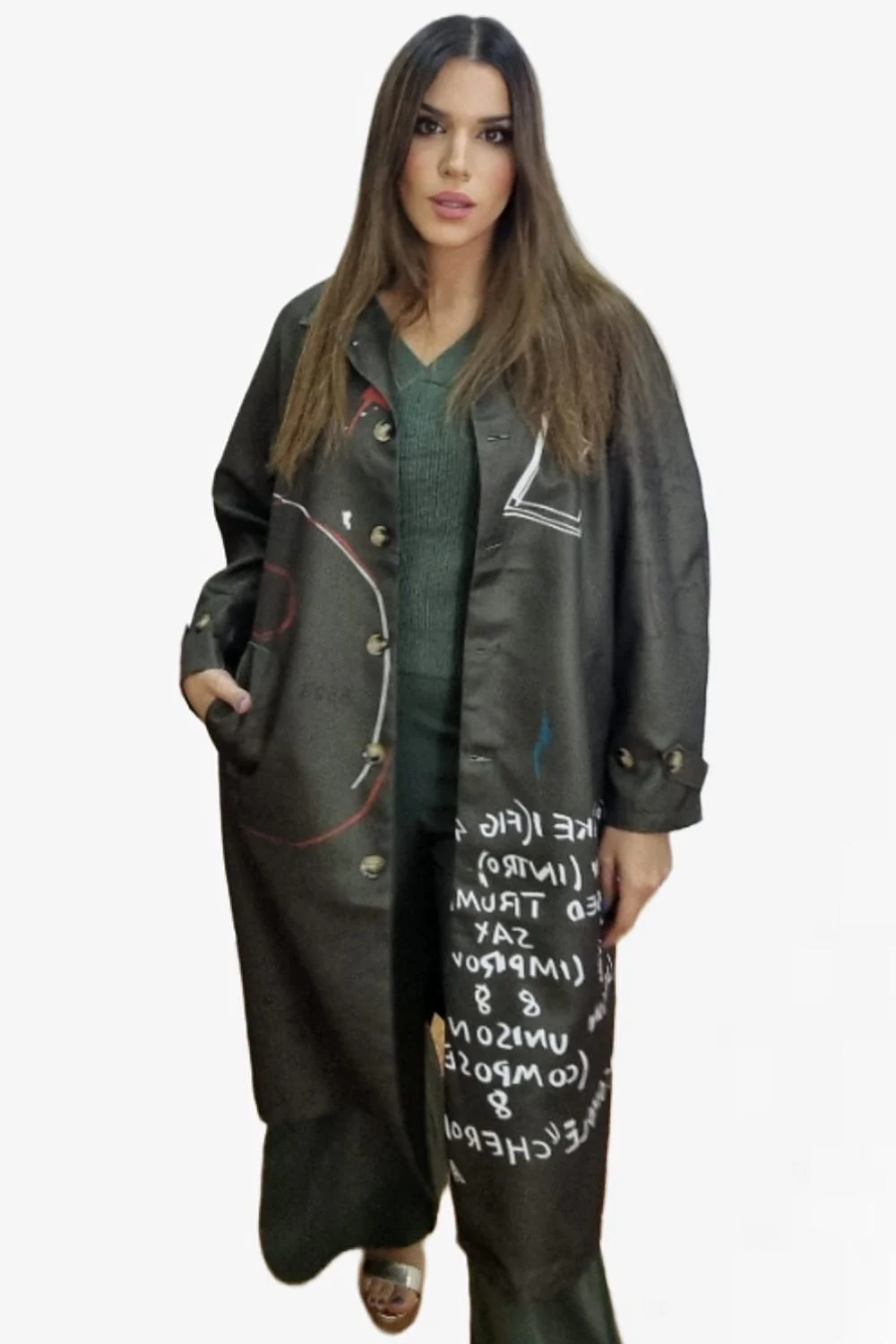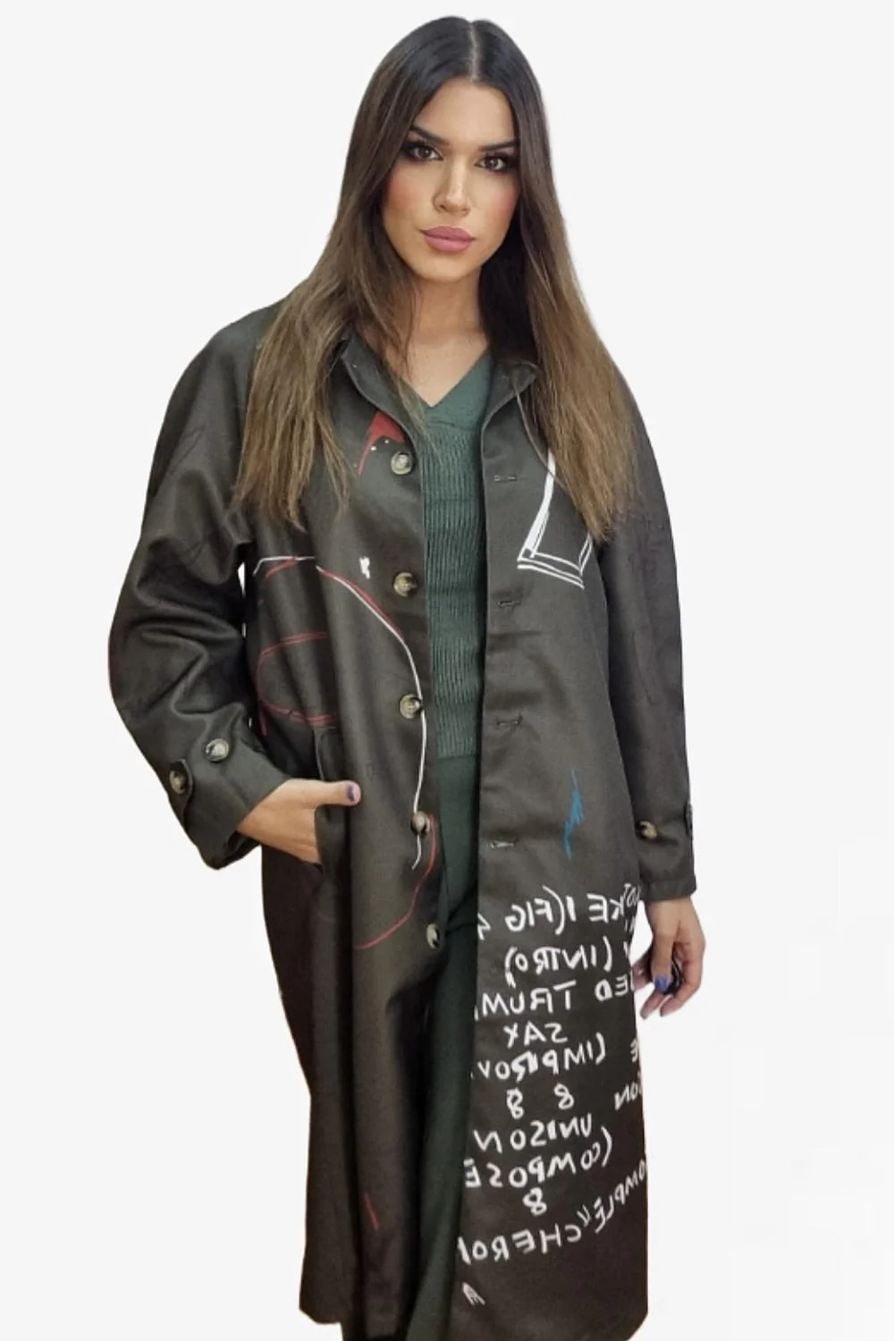 Abrigo tipo gabardina abotonada, con bolsillos y garabatos.