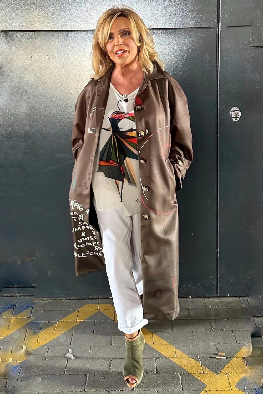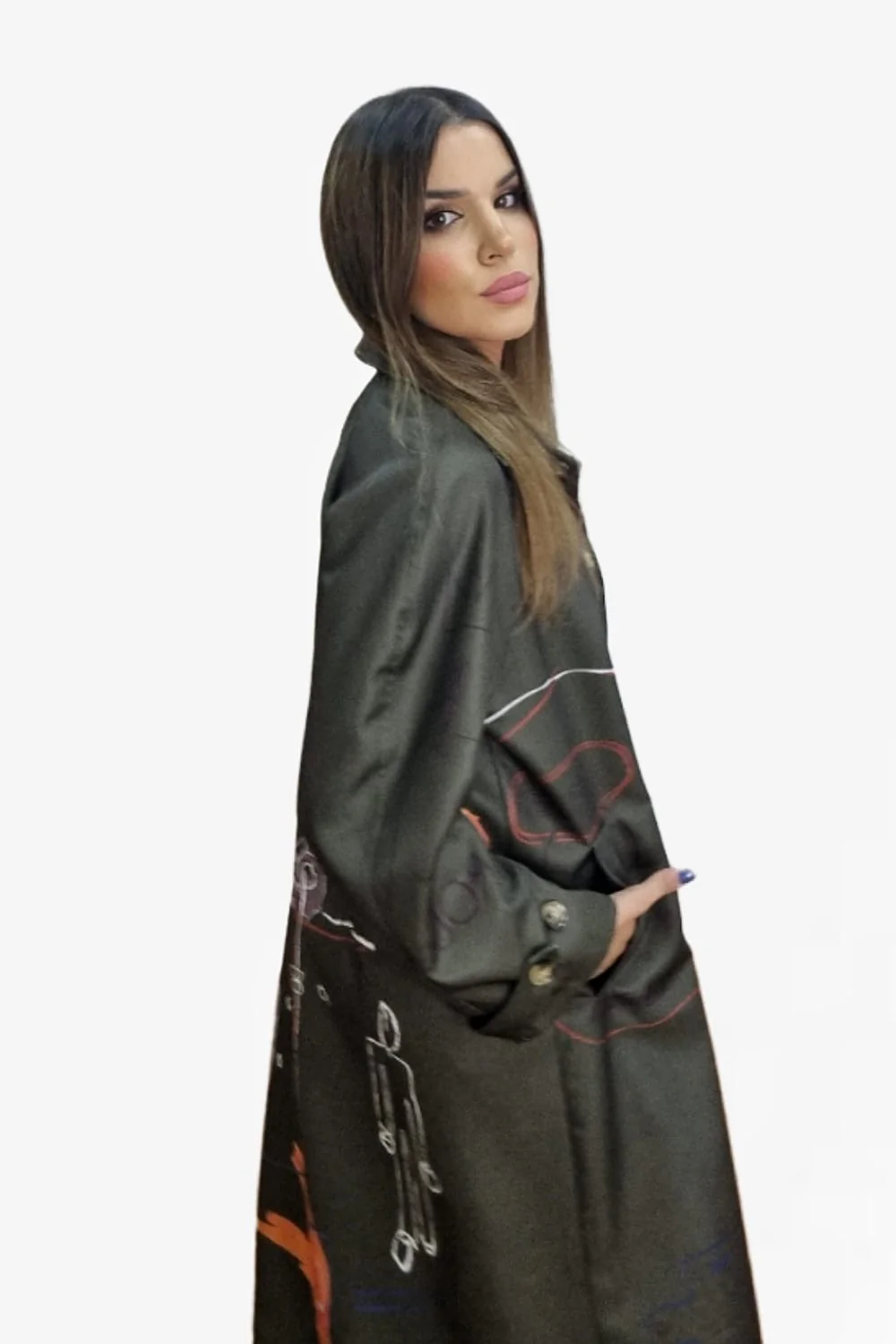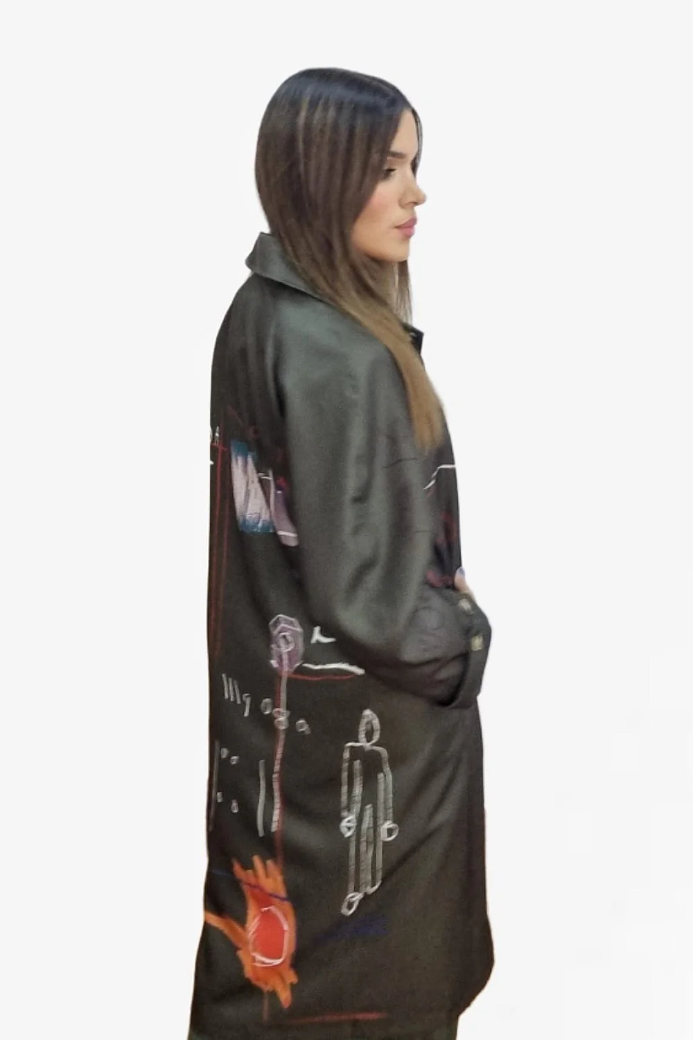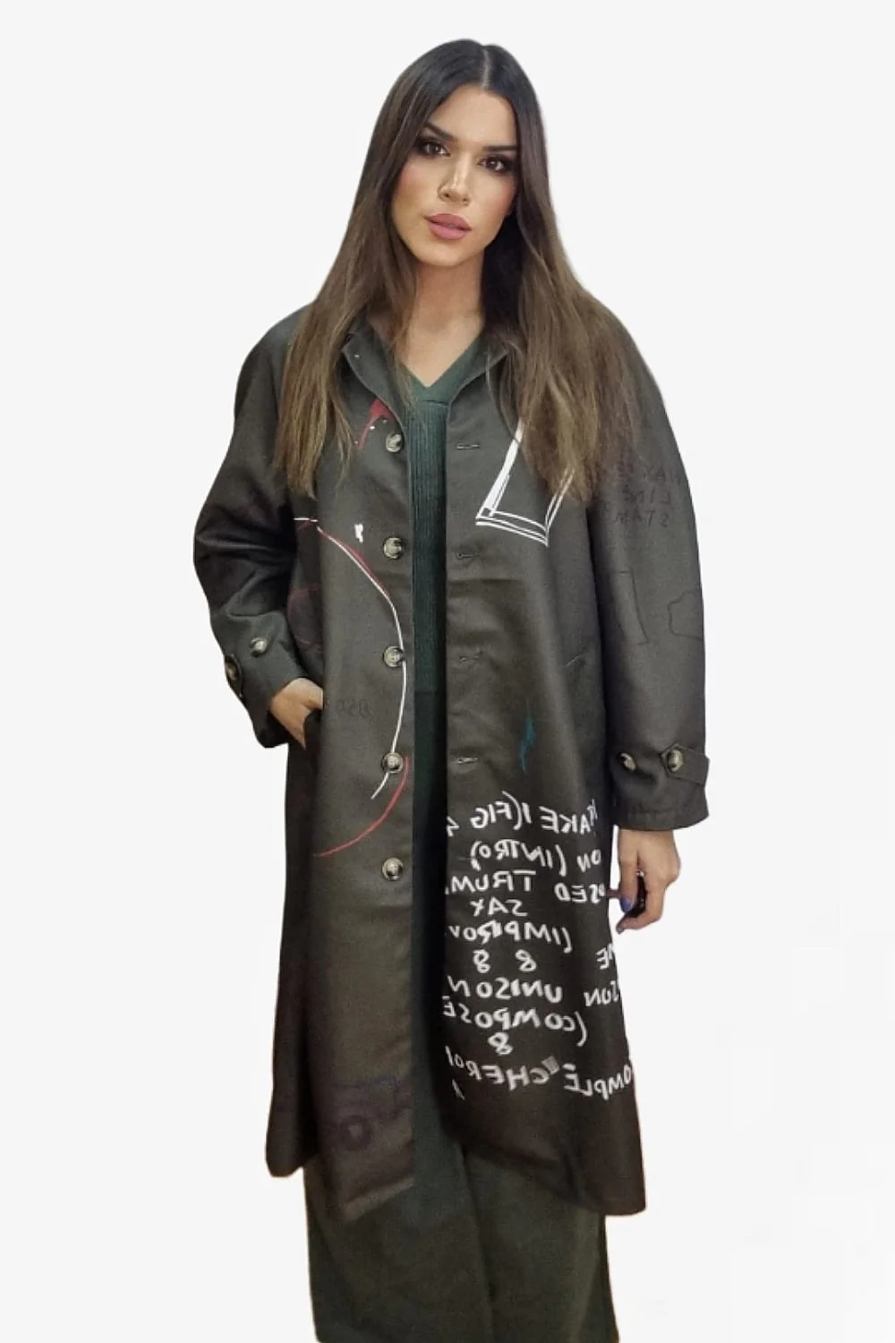 Abrigo tipo gabardina abotonada, con bolsillos y garabatos.