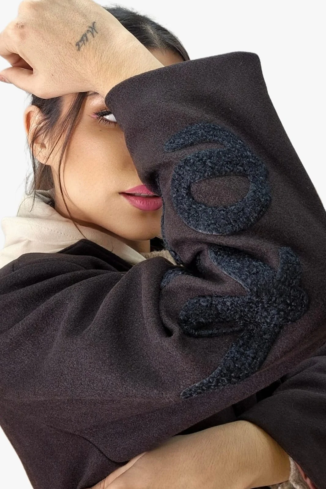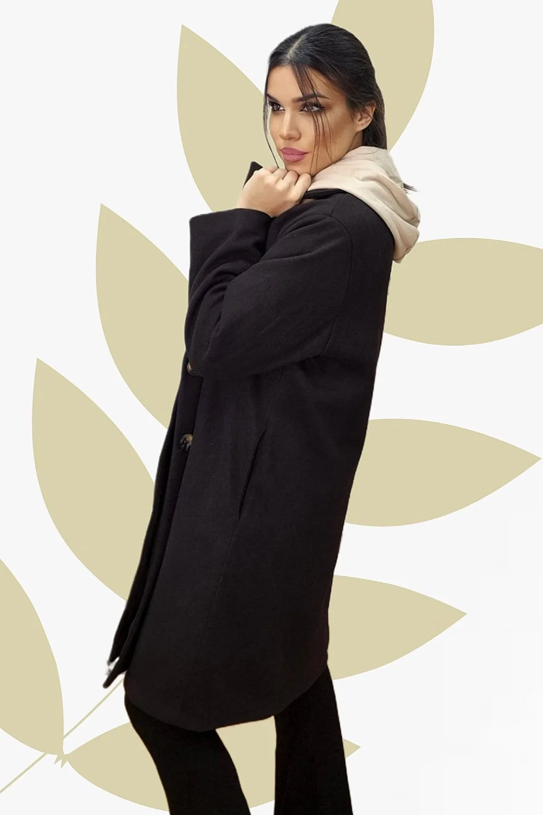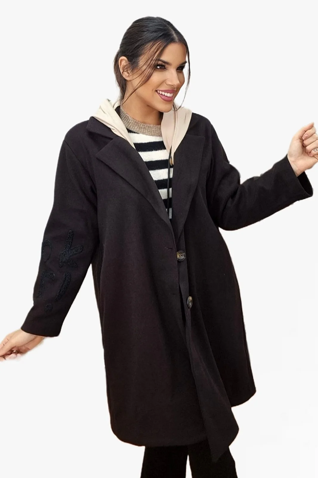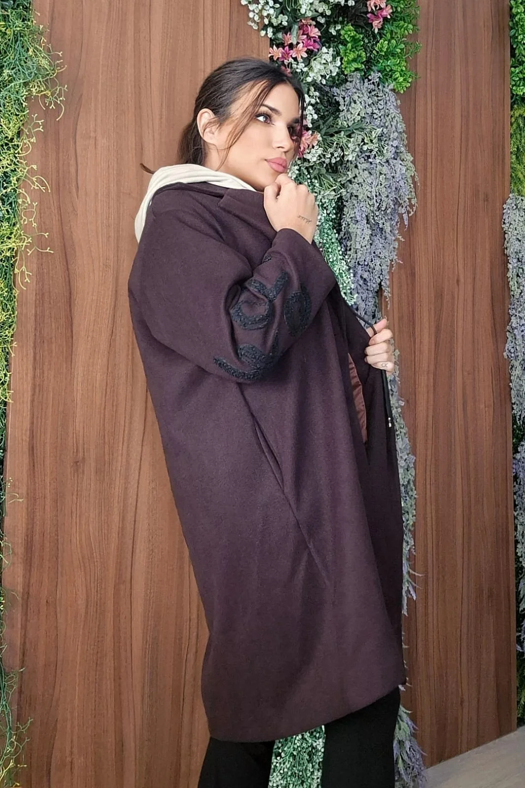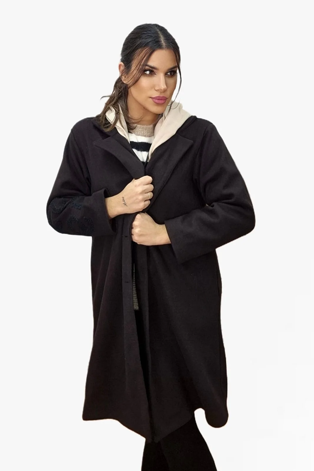 Abrigo de paño, corte tres cuartos con capucha, solapas y manga con detalle en 3D de marca.