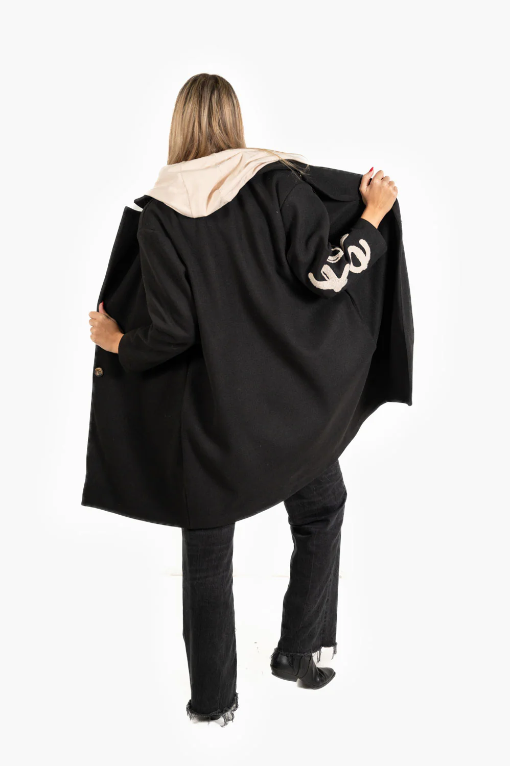 Abrigo de pa帽o, corte tres cuartos con capucha, solapas y manga con detalle en 3D de marca.