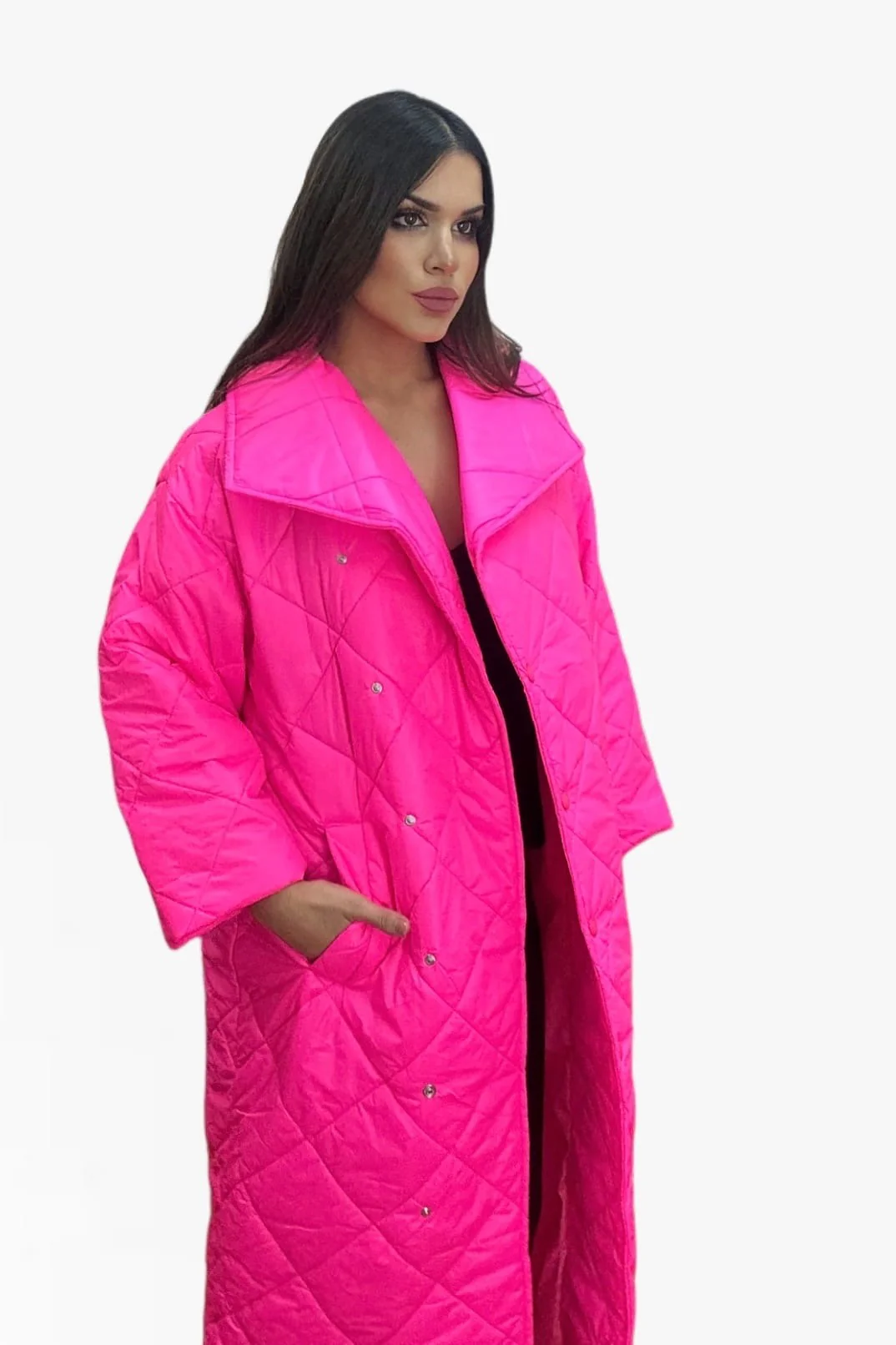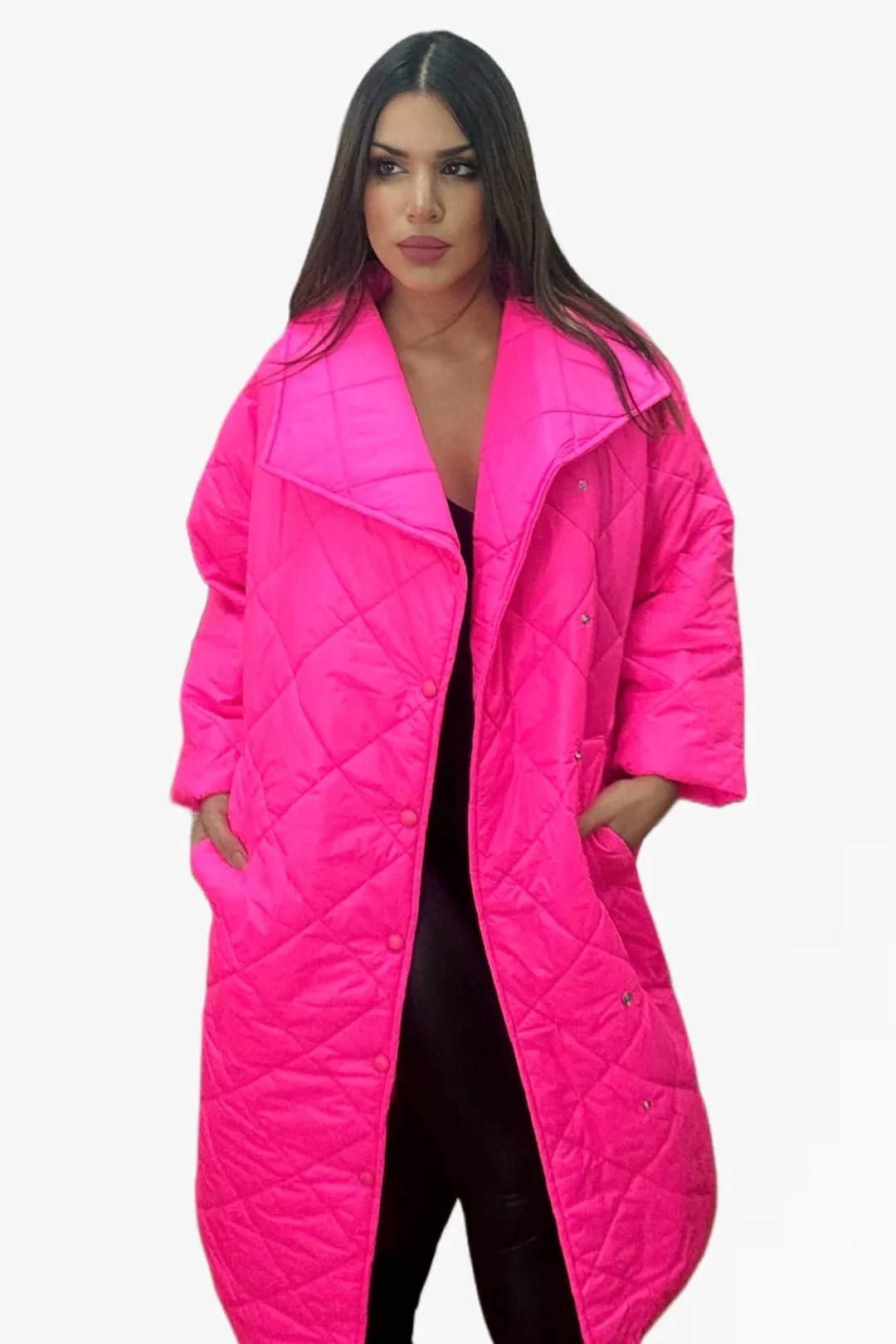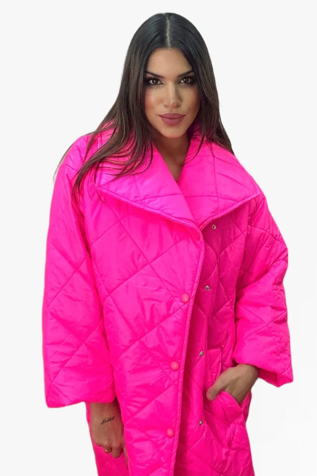 Abrigo acolchado oversize, solapa grande, con bolsillos y abotonado.