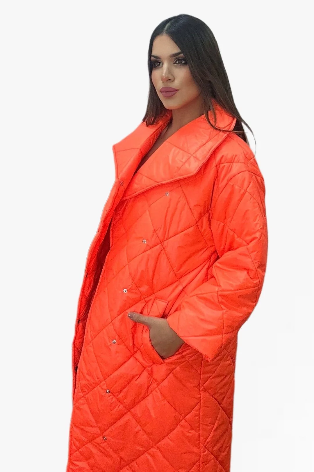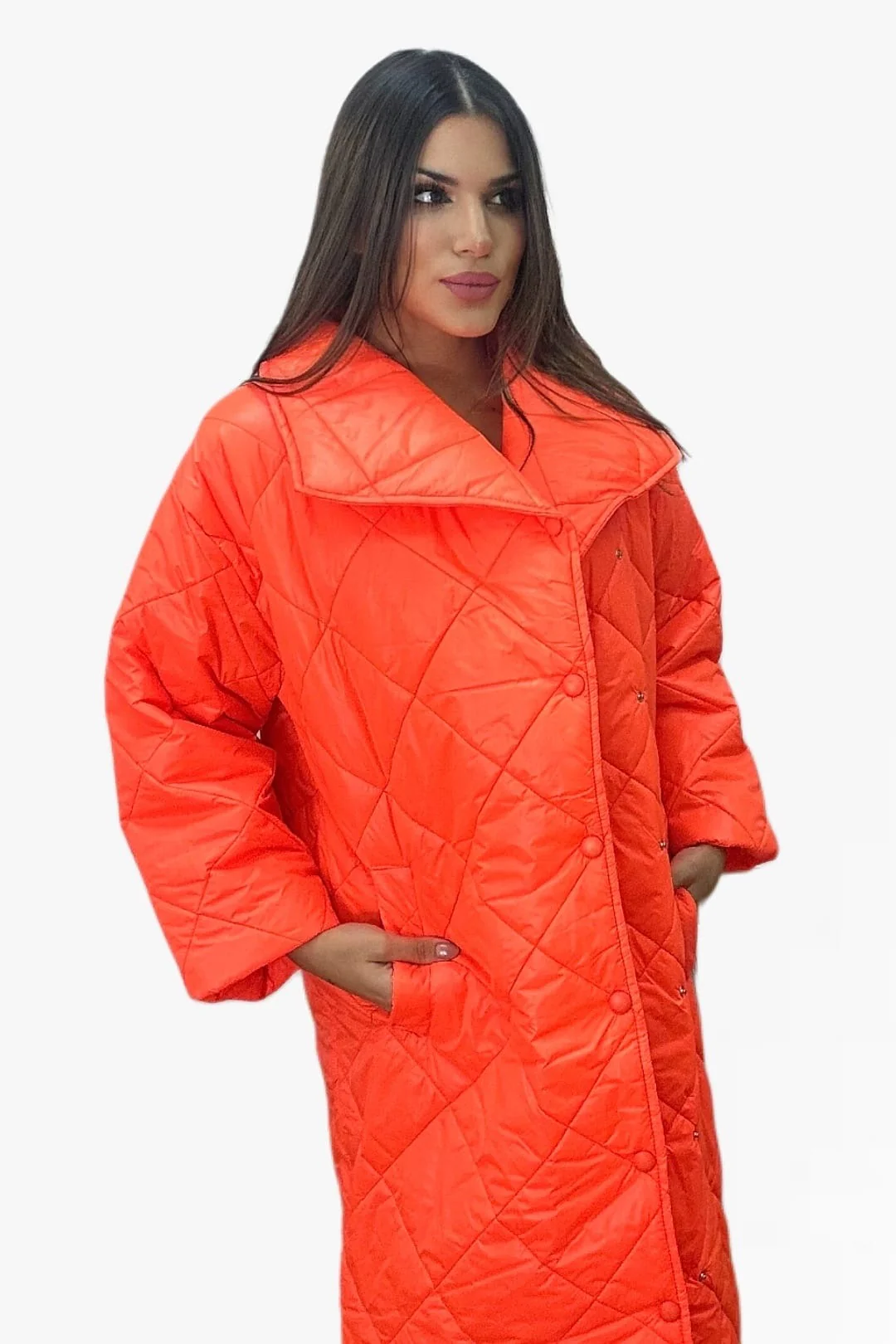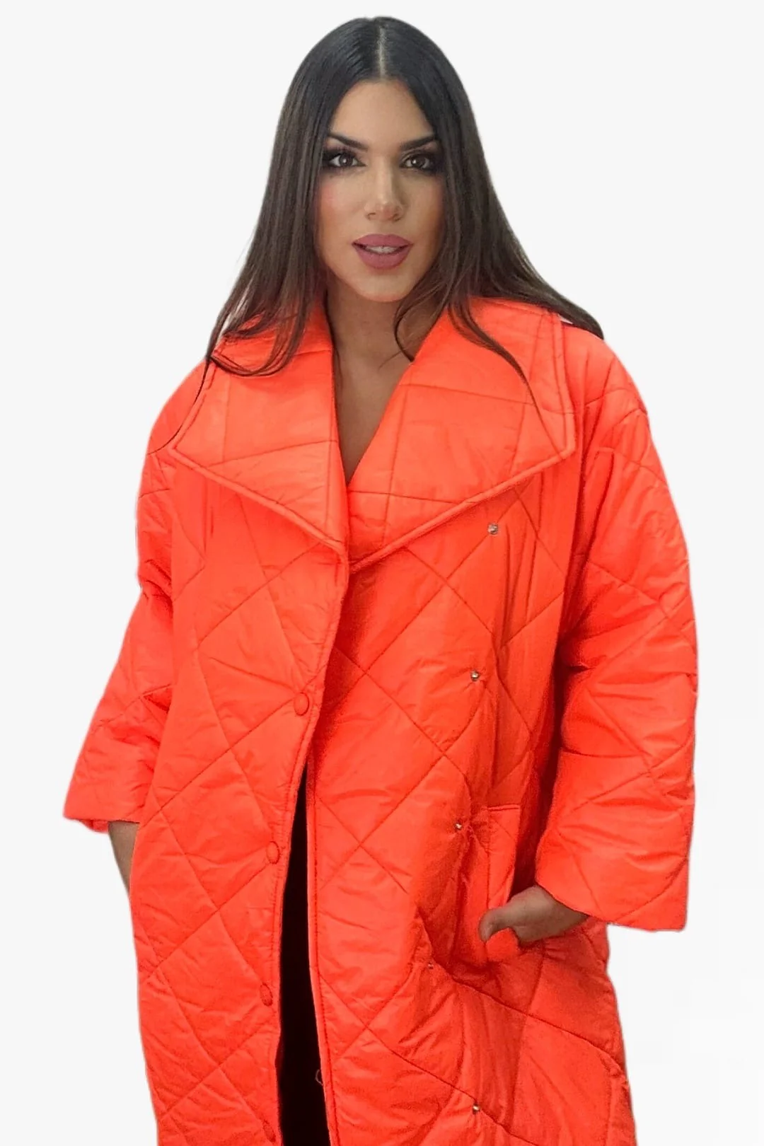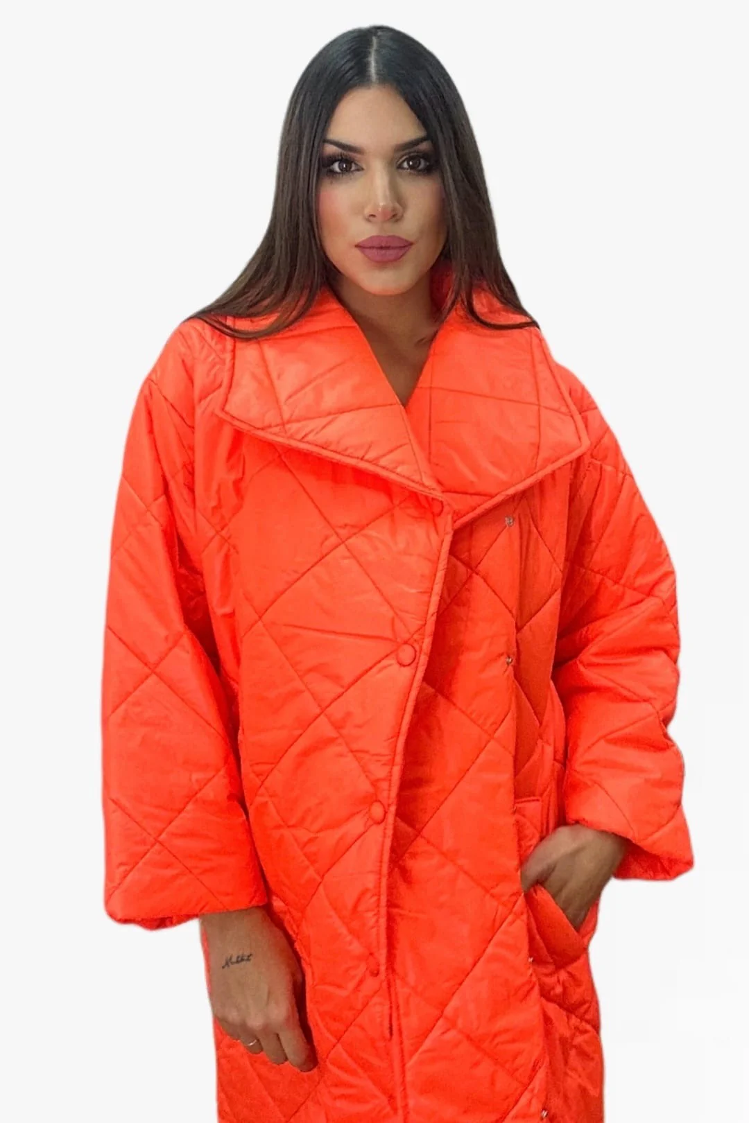 Abrigo acolchado oversize, solapa grande, con bolsillos y abotonado.