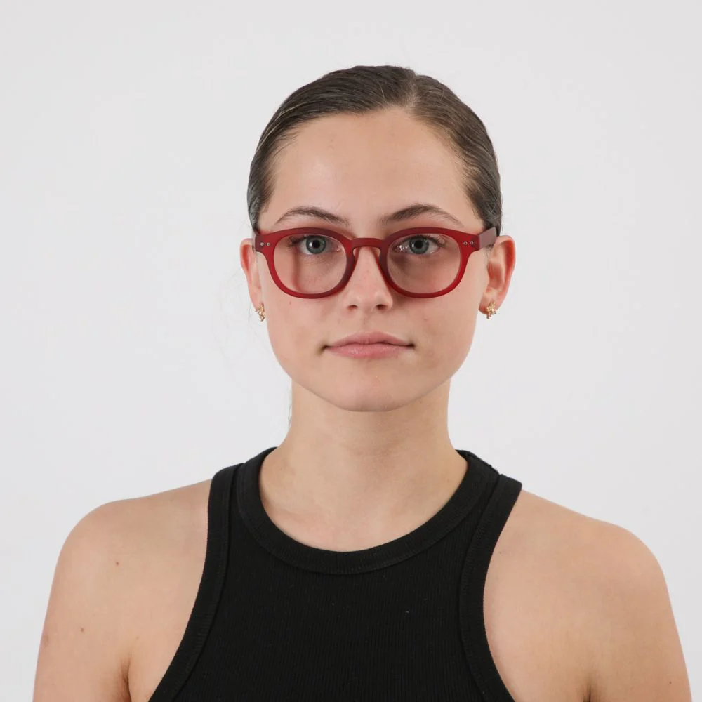 Anteojos de lectura con montura estilo «wayfarer» en color rojo oscuro. Cuenta con 1.0, 1.5, 2.0, 2.5 y 3.0 de aumento.