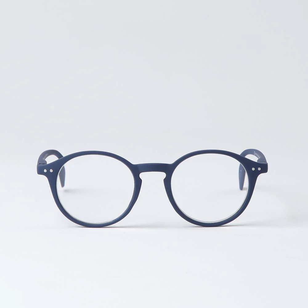 Anteojos con marco redondo delgado. Anteojos ópticos de color azul marino con acabado opaco. Estos lentes cuentan con diotropía 2,0.