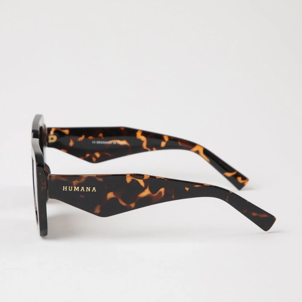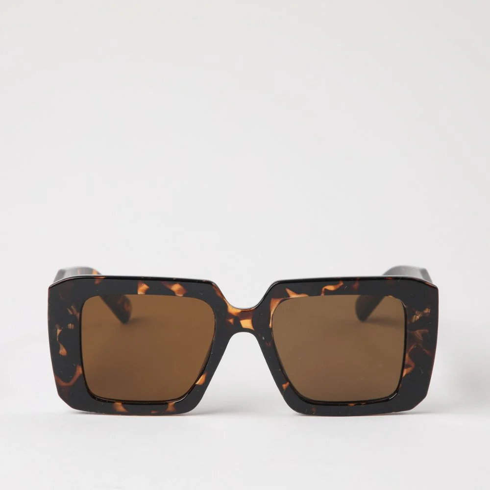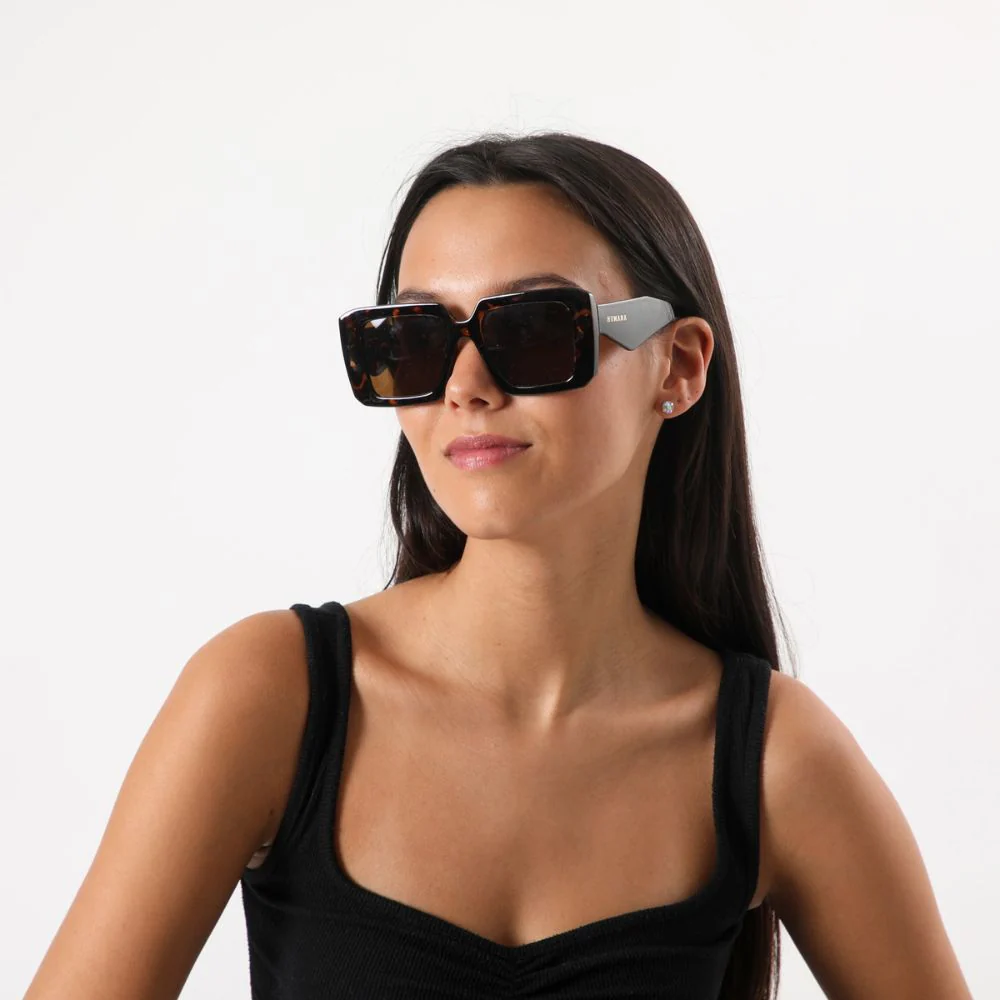Anteojos de sol estilo «square» con marco en acabado carey de tonalidades cafés. Lente en color café. Viene con estuche de ecocuero rojo y pañito para limpiar.