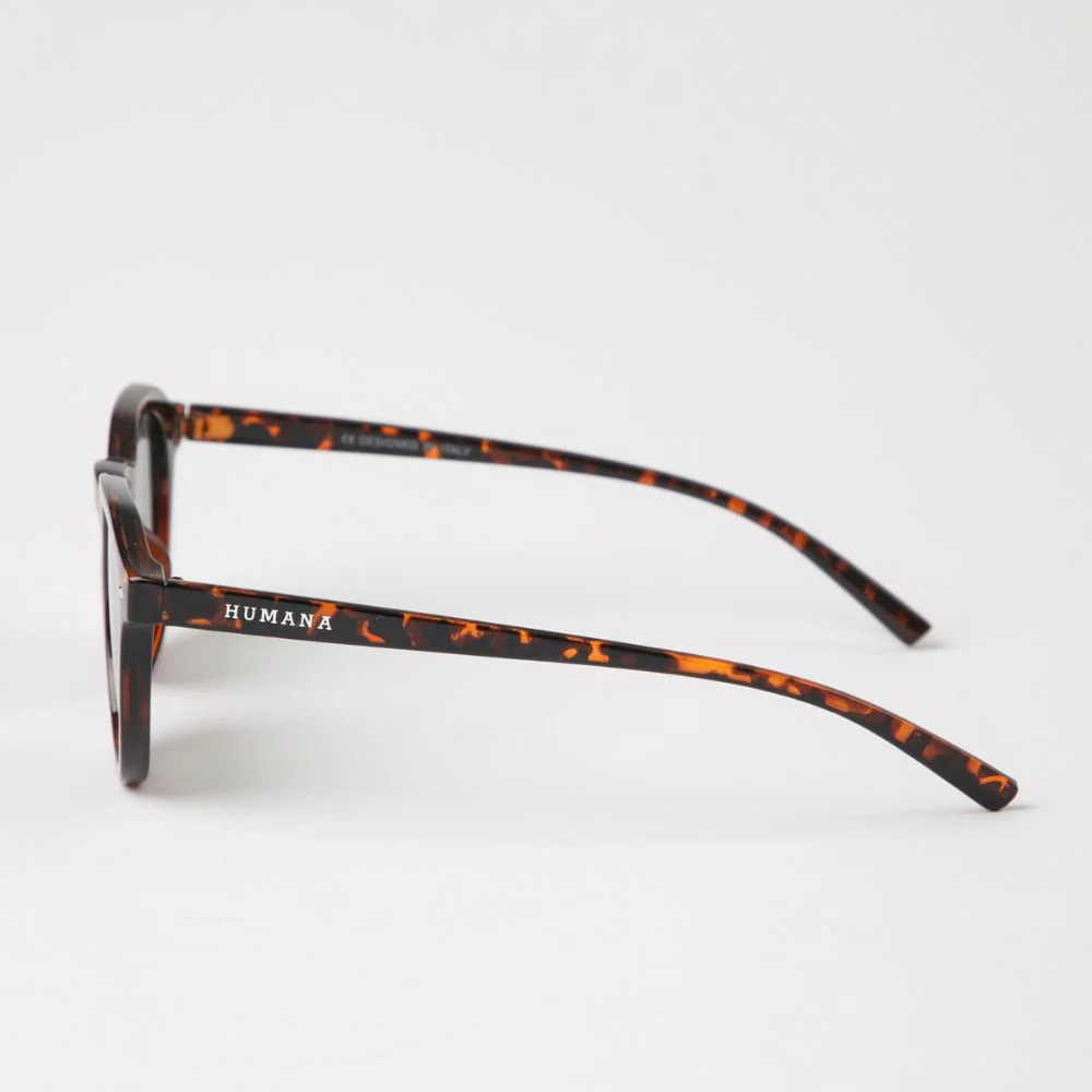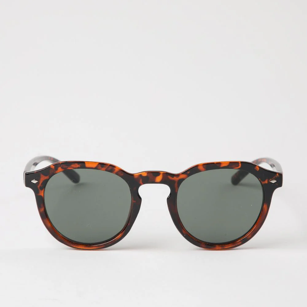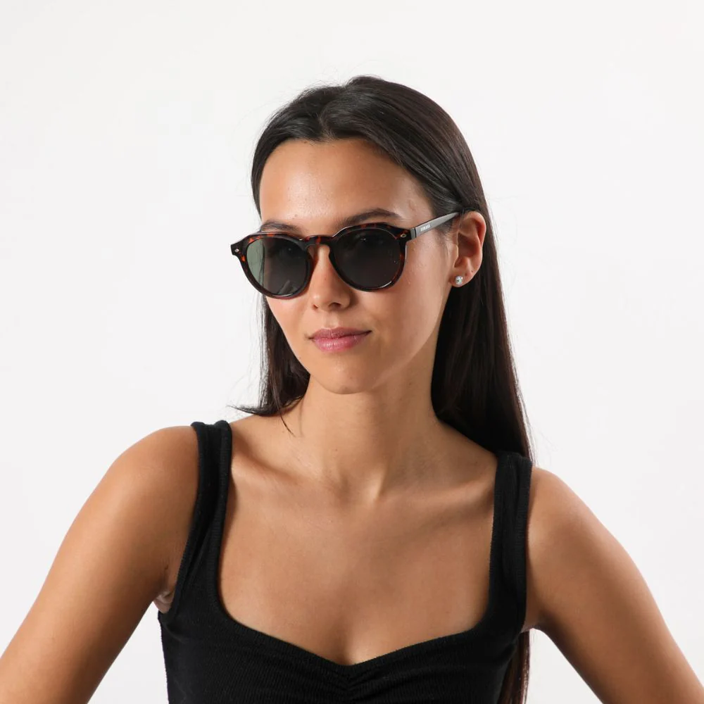 Anteojos de sol estilo «phantos» con marco en acabado carey de tonalidades cafés. Lente en color verde azulado oscuro. Viene con estuche de ecocuero verde y pañito para limpiar.
