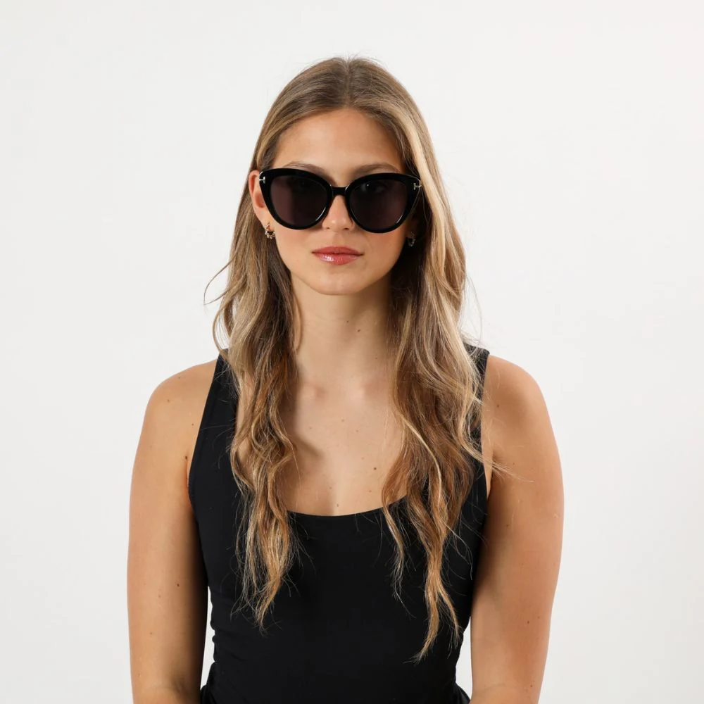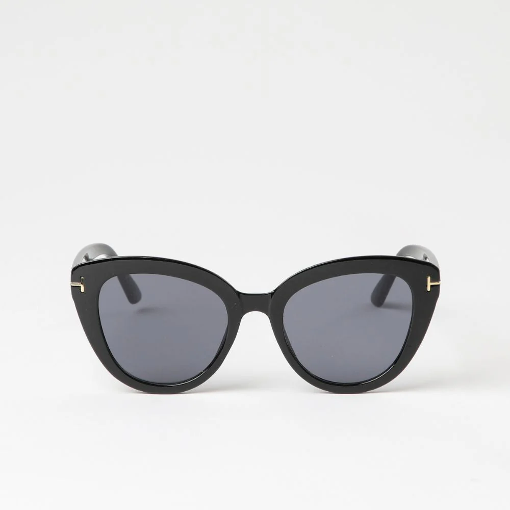 Anteojos de sol Galapagos estilo «cat eye» negro con detalles dorados en los vértices. Lente en color negro.