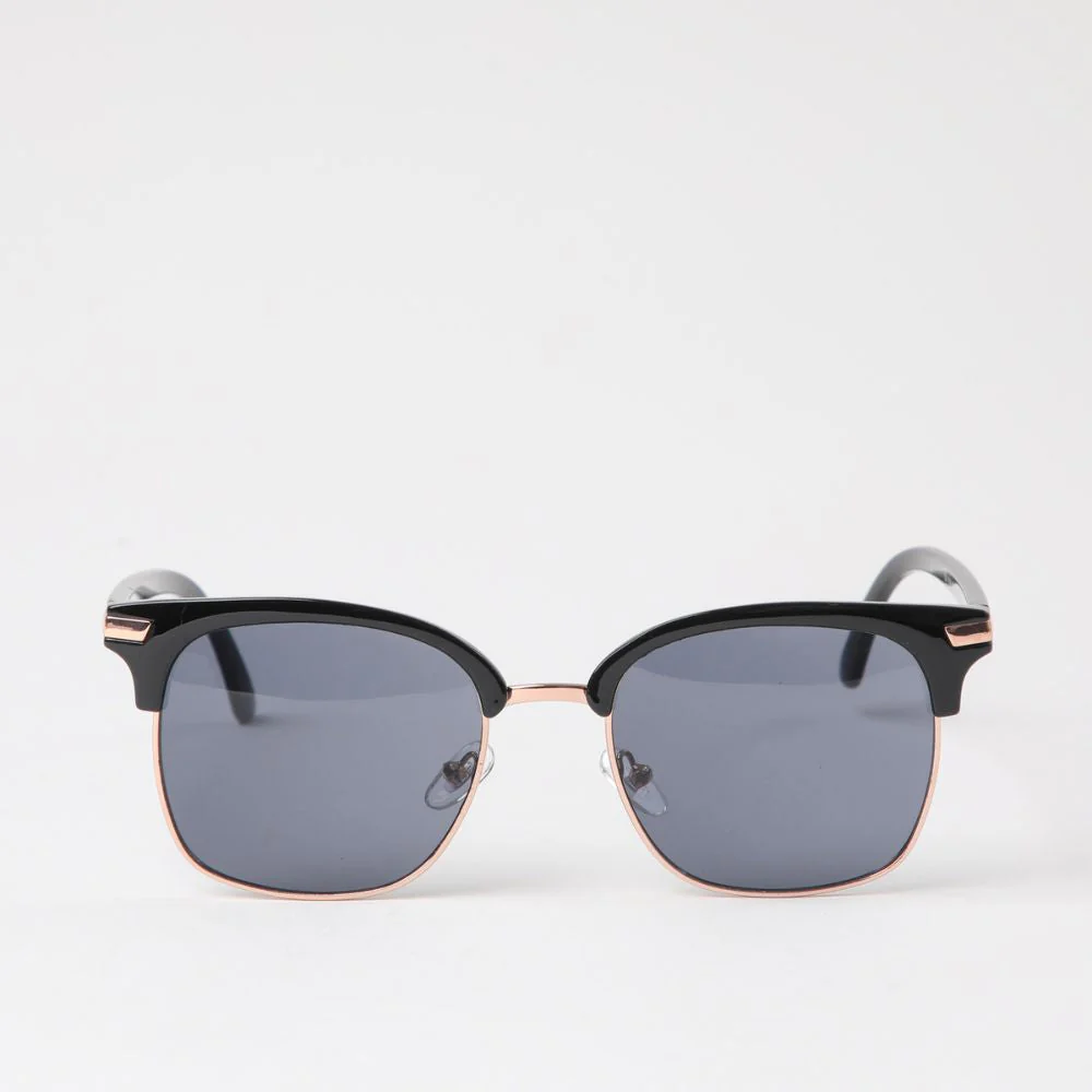 Anteojos de sol Laura estilo «club master» con montura negra sobre metal rosegold y con detalle de rectángulo dorado. Lente en color negro.