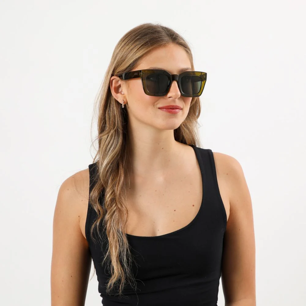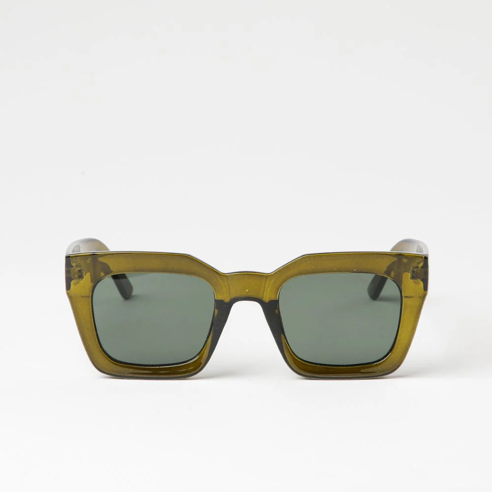 Anteojos de sol Mancora Green estilo «wrap»/»cat eye» con montura verde semintransparente. Lente en color negro verdoso.