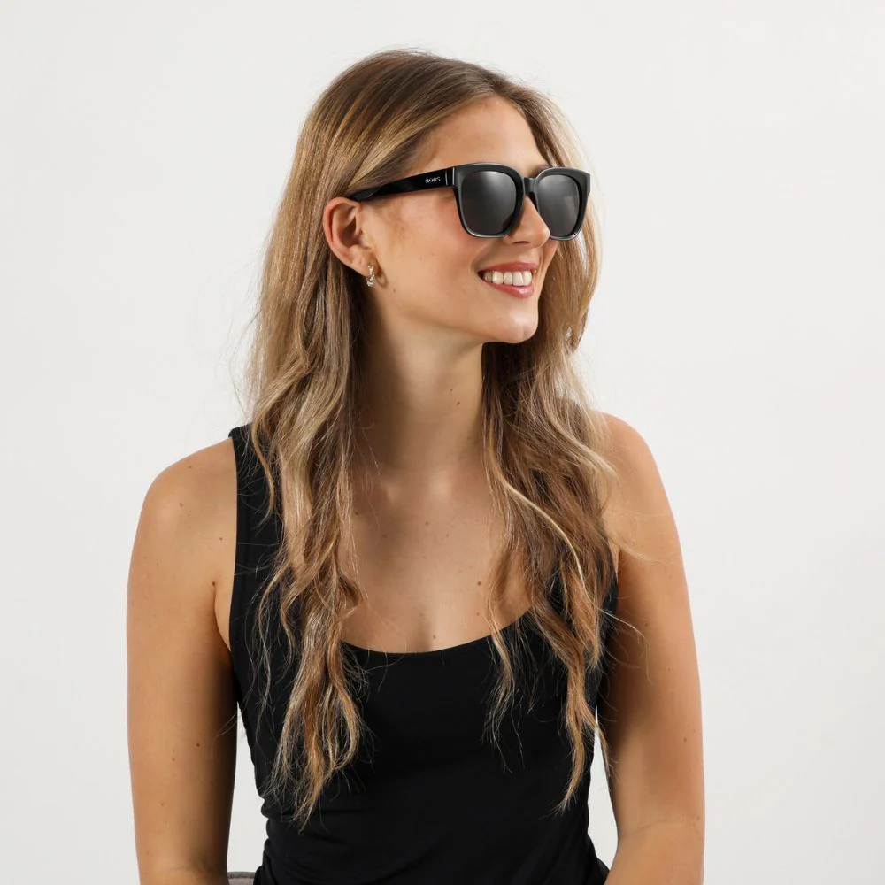 Anteojos de sol Papete estilo «wayfarer»/»butterfly» negro con relieve en esquinas superiores. Lente en color negro.