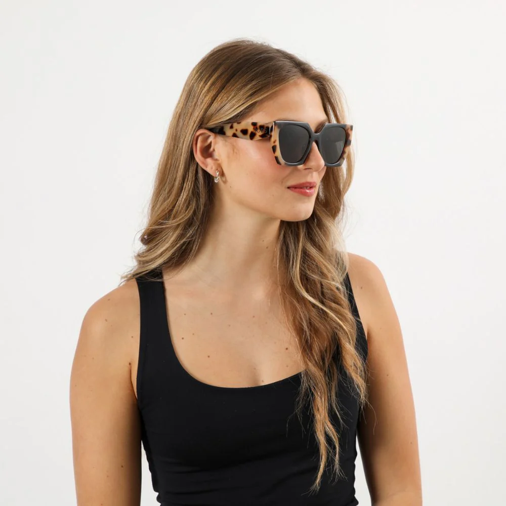 Anteojos de sol Santorini Black estilo «cat eye» con montura en acabado carey con tonalidades negro y beige. Lente en color negro.