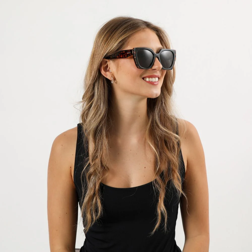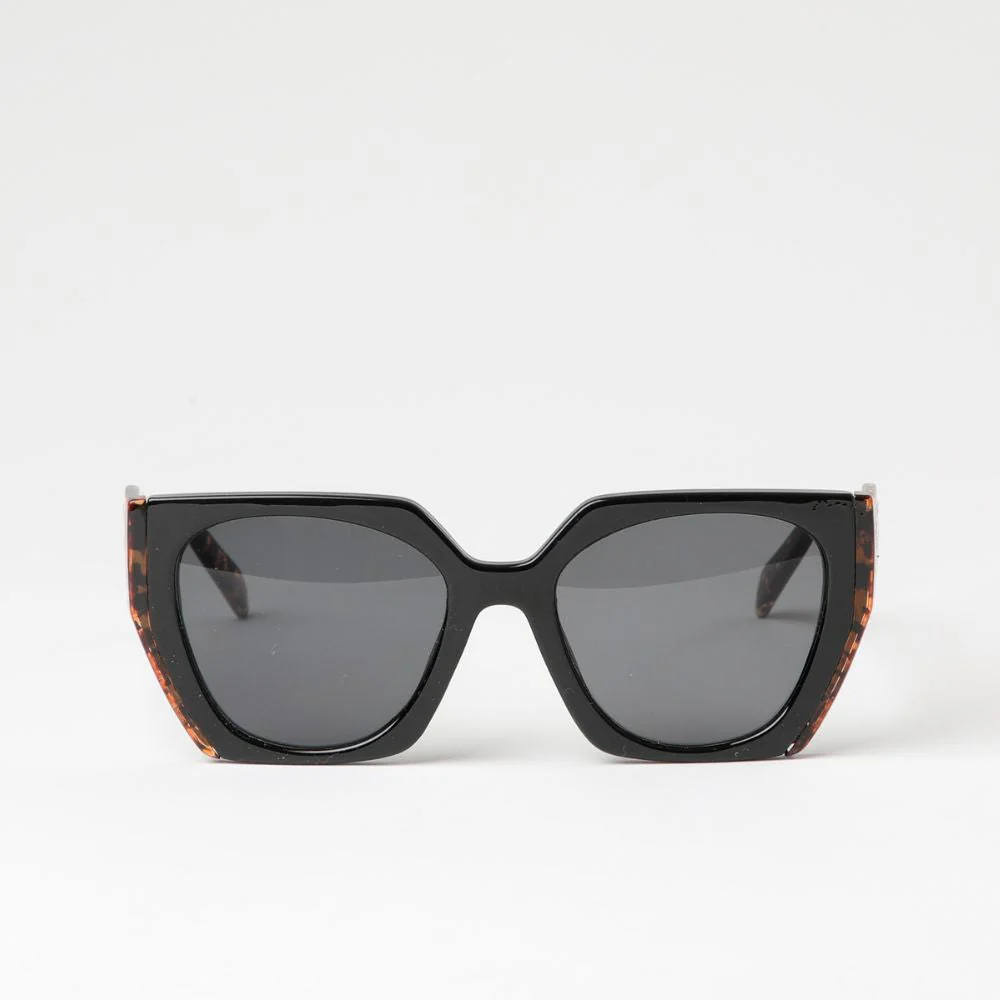 Anteojos de sol Santorini Turtle estilo «cat eye» con montura negra con partes en café semitransparente con manchas tipo «tinta en agua» negras. Lente en color negro.