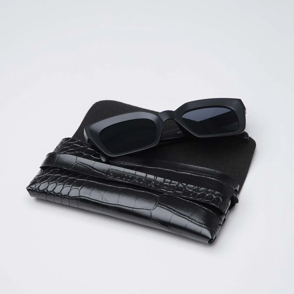 Anteojos Sol Humana Maui de color negro. Anteojos de sol de marco rectangular negros opacos con estuche de ecocuero negro con textura animal.