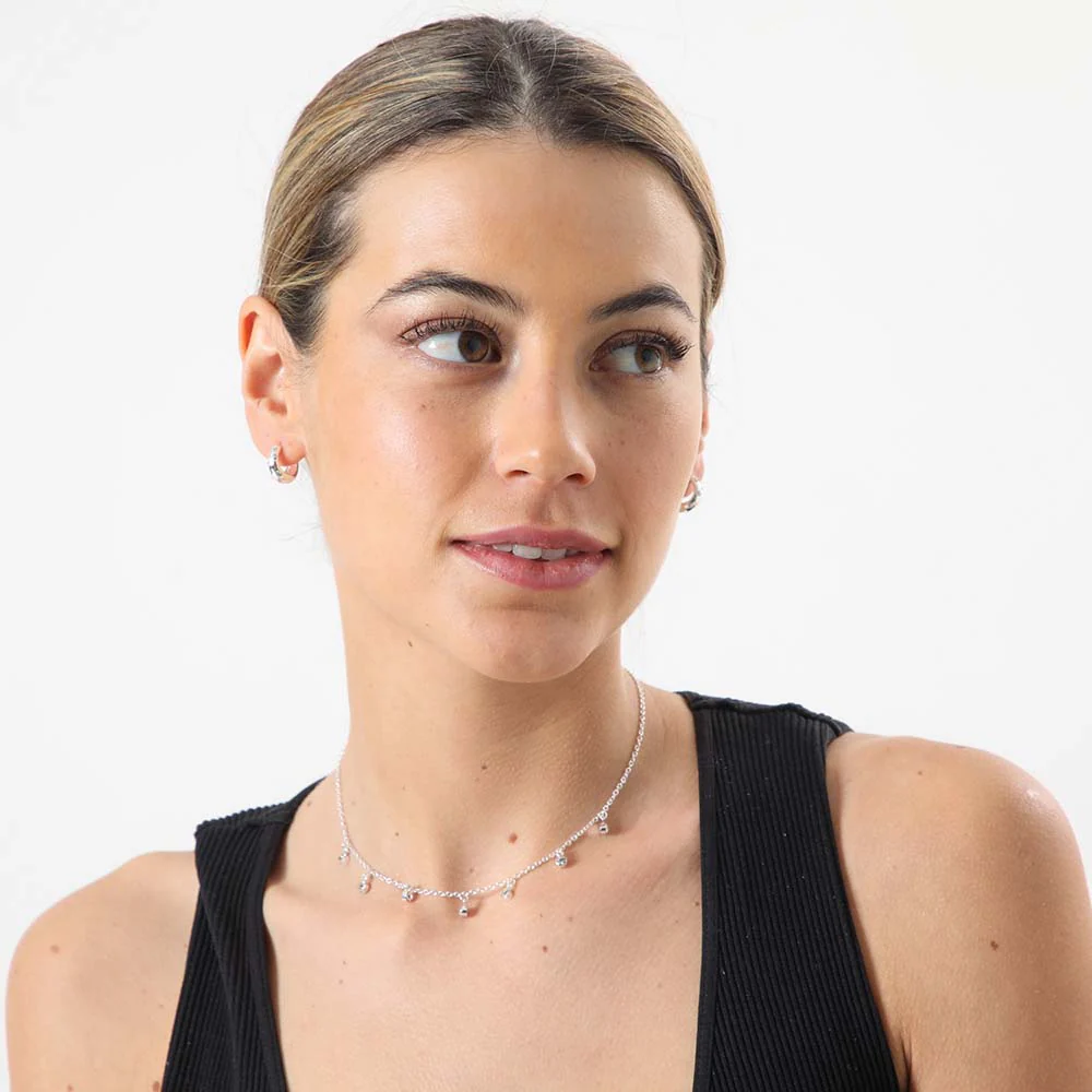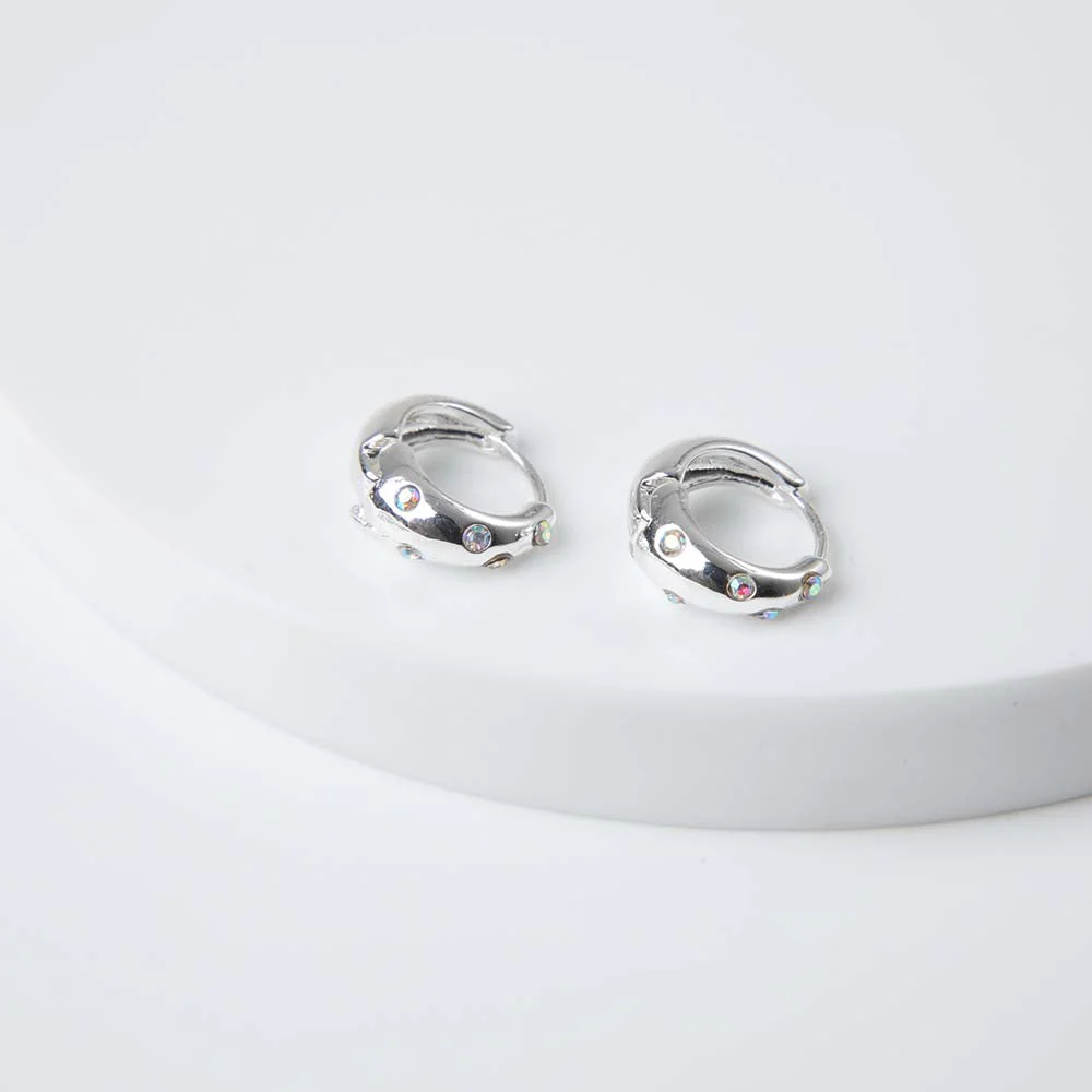 Argollas ID Ata de color plateado. Es un par de argollas anchas con incrustaciones de brillantes de fantasía tornasol