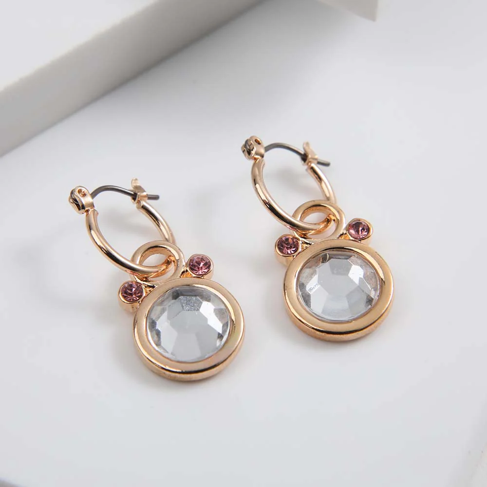 Argolla Tatienne Marsella de color rosado. Argollas lisas doradas con charm redondo de piedra de fantasía transparente con cristales de fantasía de color rosado.