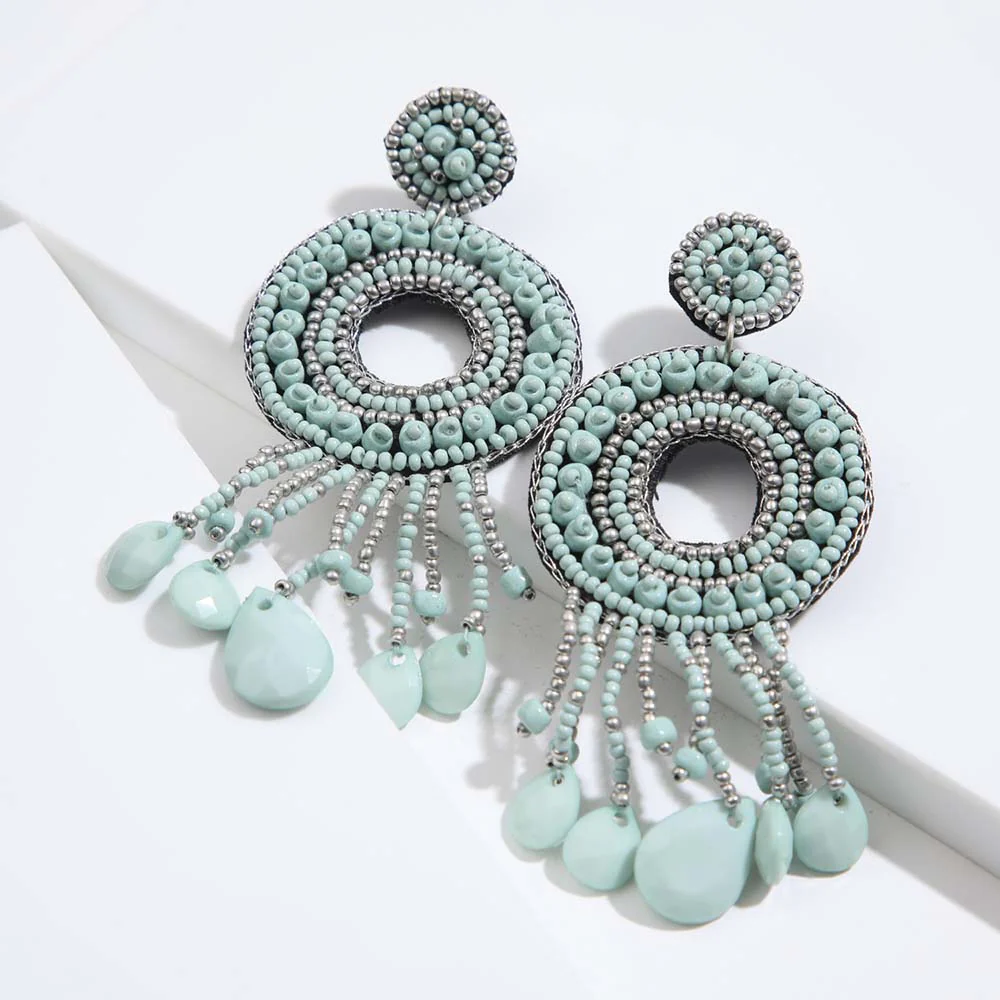 Aros Acacia Celeste Humana. Combinado con mostacillas en color plateado y celeste.