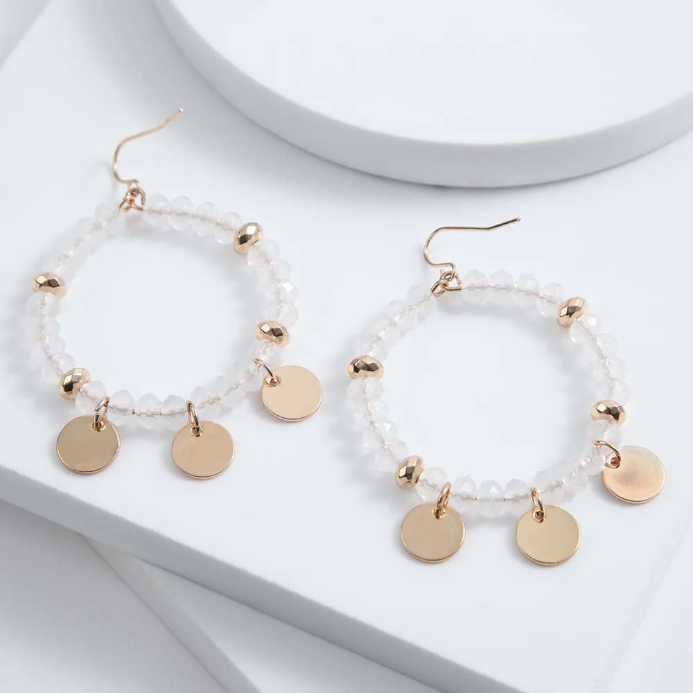 Aro Argolla i-D Maragogi de color blanco. Son un par de aros colgantes con una argolla colgando con mostacillas blancas y charms circulares dorados.