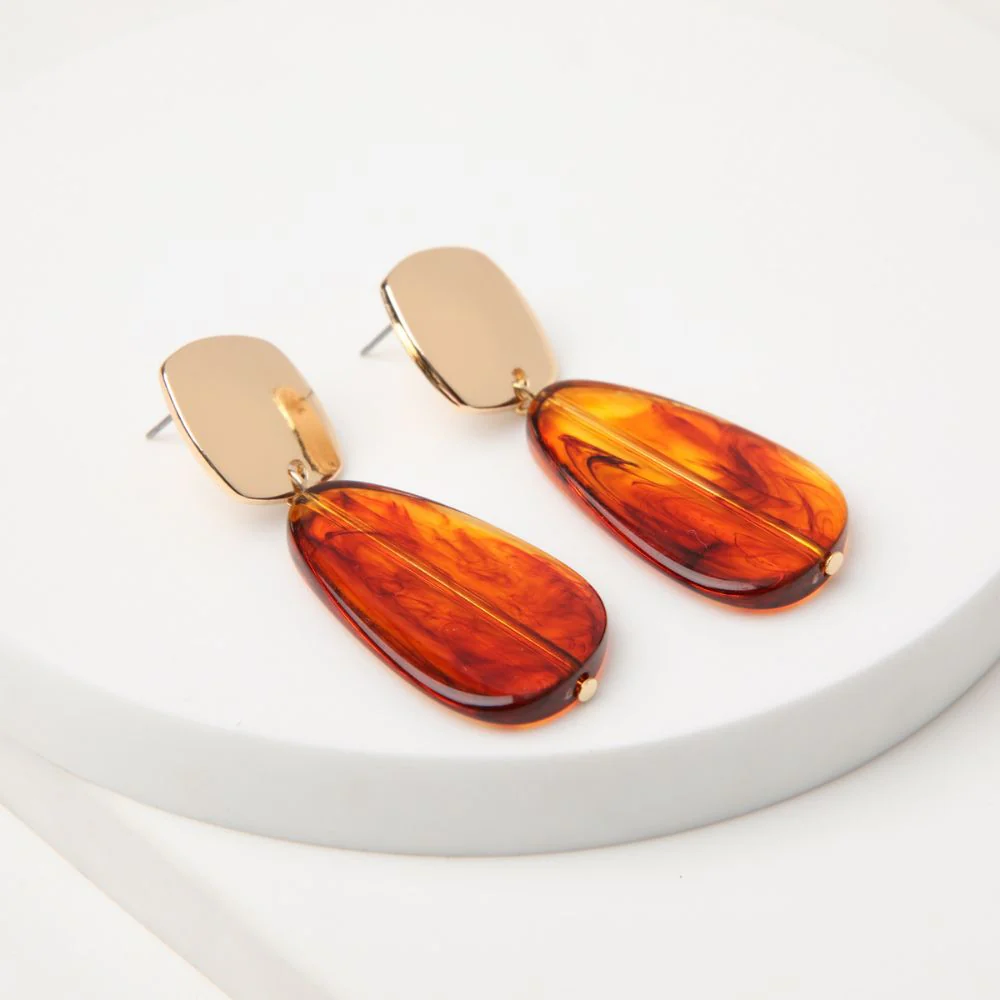 Aros largos de placa metálica dorada cuadrada con mostacilla plana semitransparente en tonalidades ambar y café, colgando.