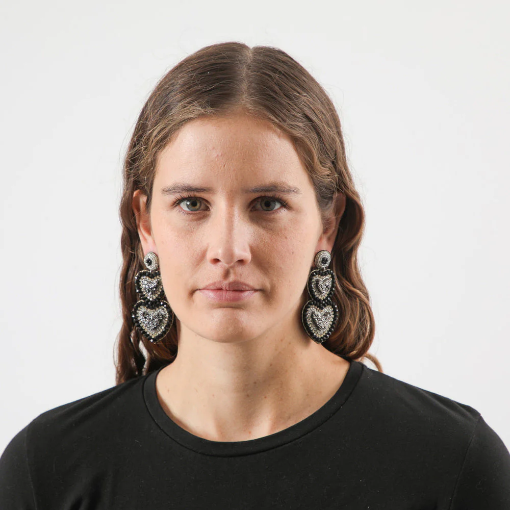 Aro largo doble corazón de mostacillas negras, transparentes y plateadas con brillantes de fantasía.