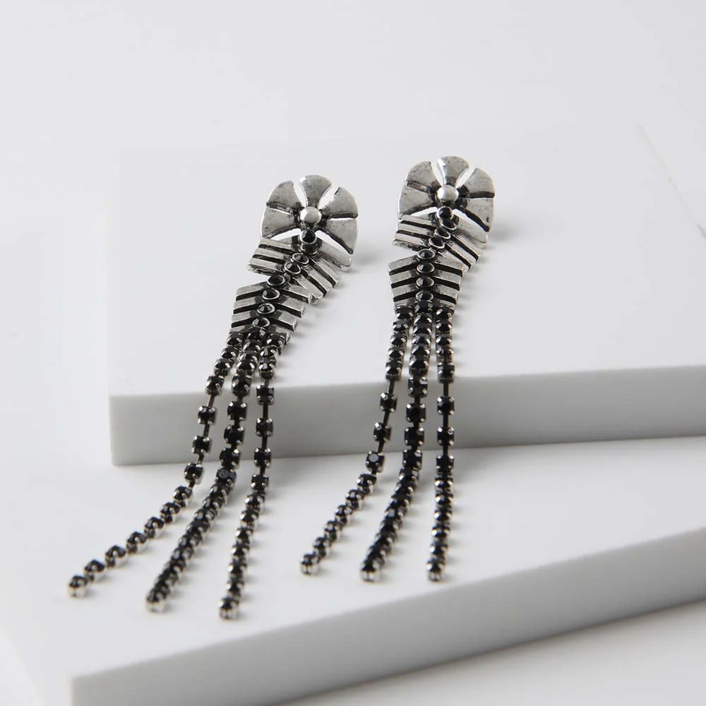 Aros colgantes plateados con forma de espiga diagonal con Piedras de fantasía brillantes en color negro