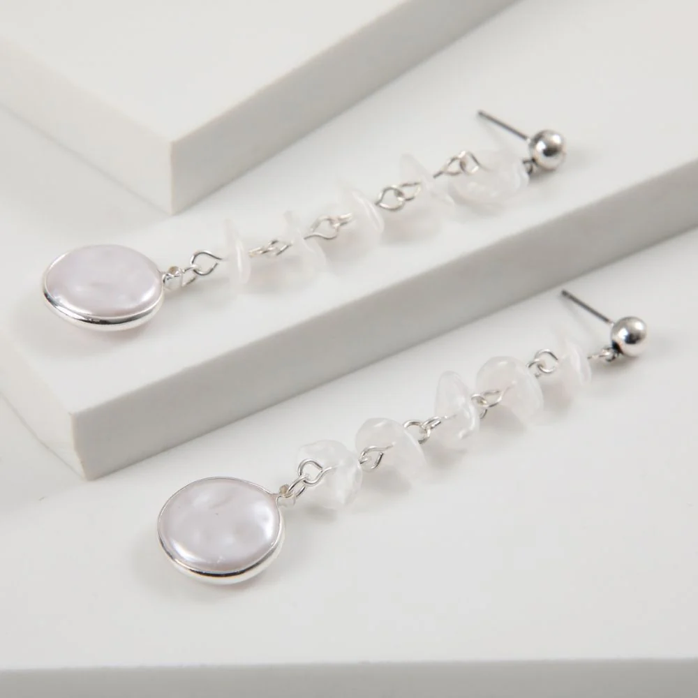Aros largos de cadena de mostacillas irregulares blancas con terminación de círculos con superficie tipo nacarado blanco.