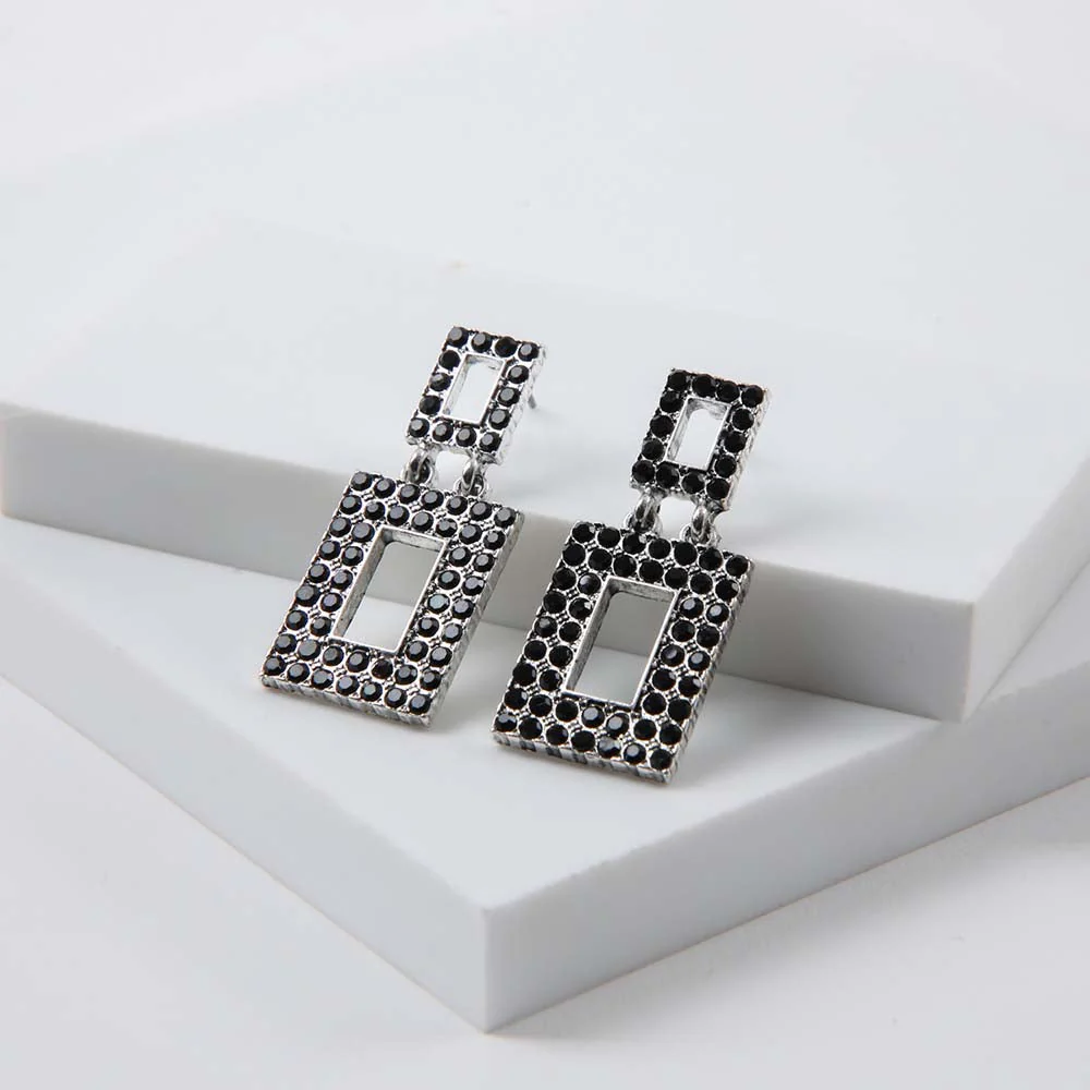 Aros colgantes plateados compuesto de eslabones rectangulares con Piedra de fantasía brillante en color negro