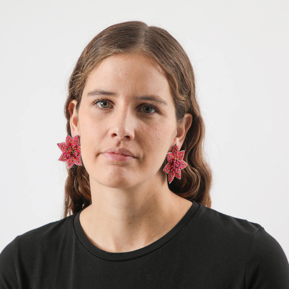 Aro pegado de flor con mostacillas rosadas, moradas y doradas.