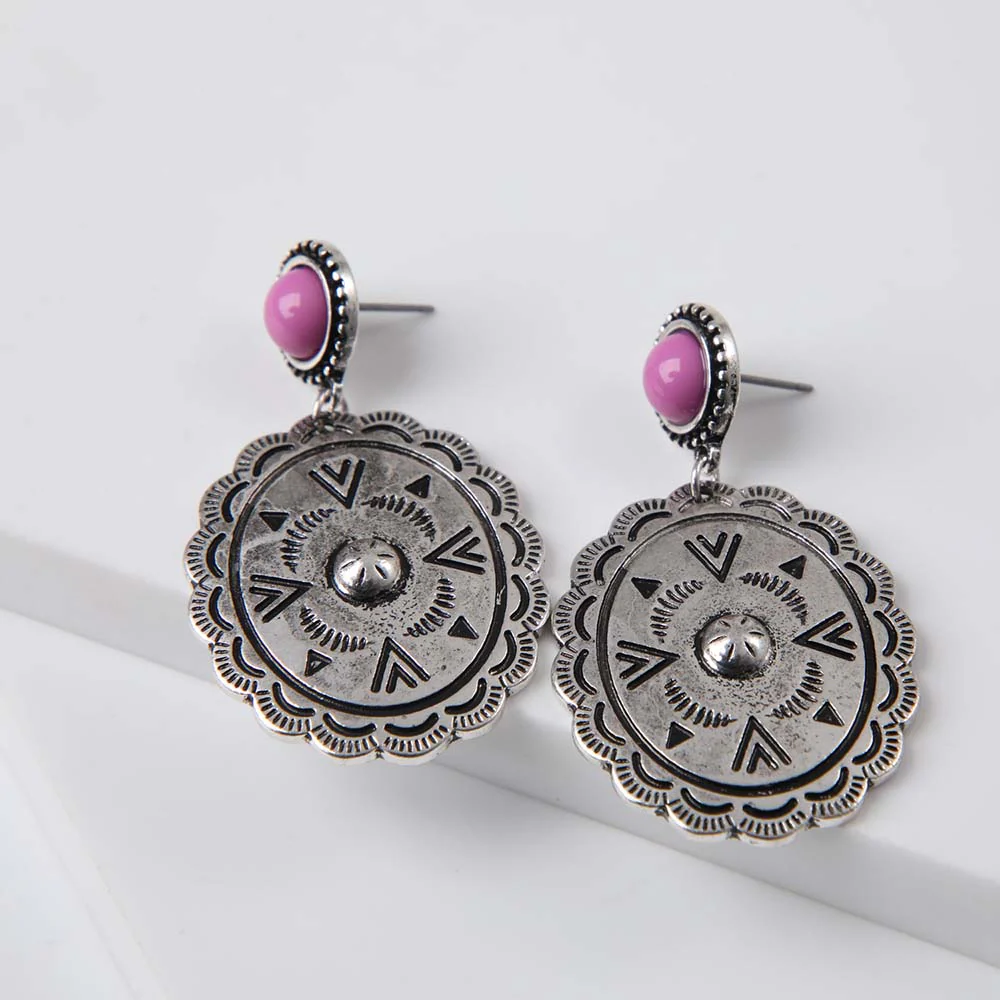 Aro Mediano Humana Regaliz de color rosado perteneciente a la colección Pink Diamond. Son un par de aros colgantes de base circular con piedra rosada de la que cuelga una pieza plateada con forma de flor.