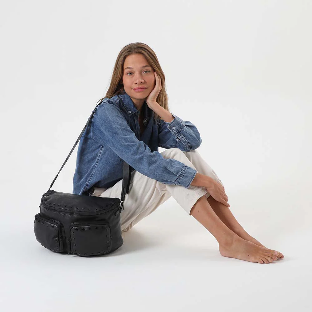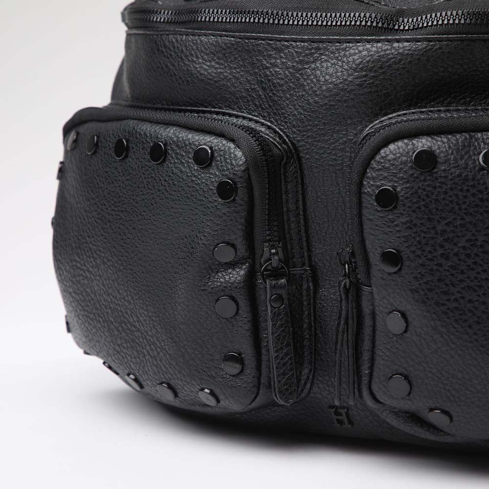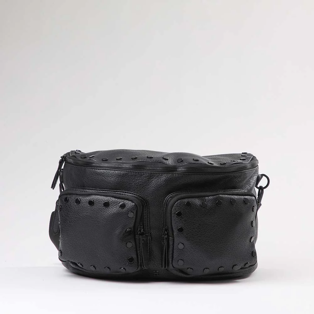 Banano rectangular. Al tener correa ajustable puede utilizarle tanto cruzado, a la cintura o colgado en el hombro. Este banano cuenta con dos bolsillos frontales con detalle de tachas y un bolsillo principal con cierre en la parte superior. En su interior cuenta con un bolsillo mas pequeño con cierre y dos bolsillos organizadores.