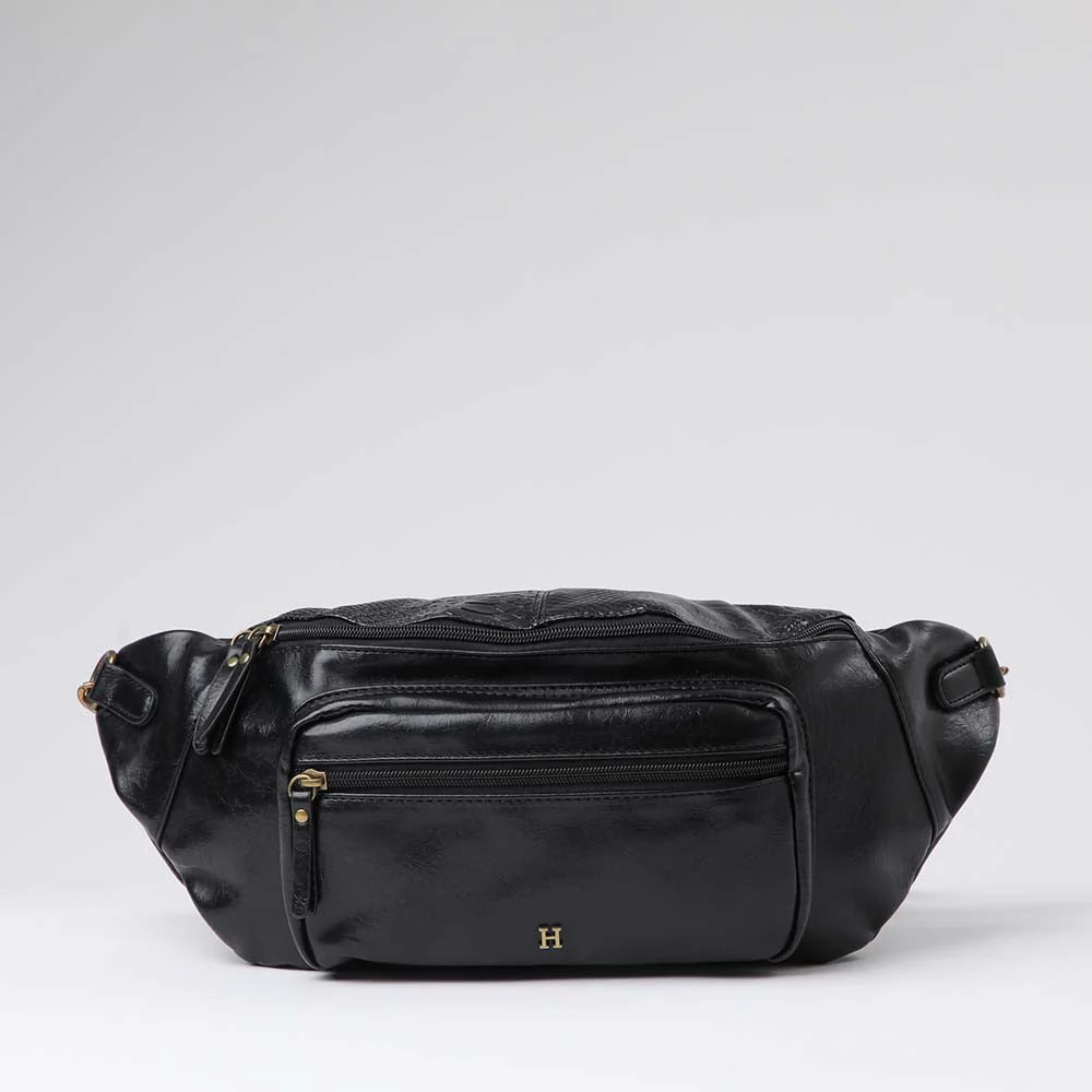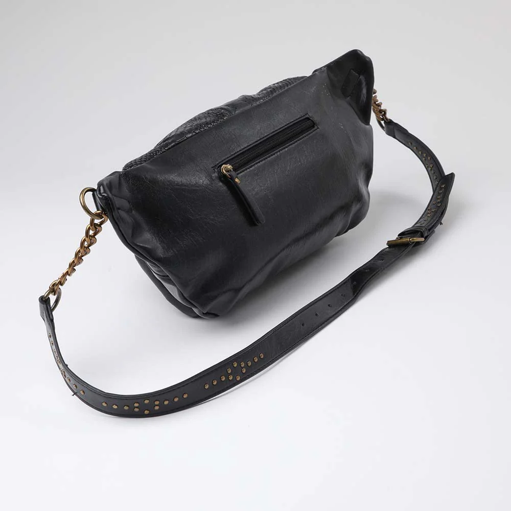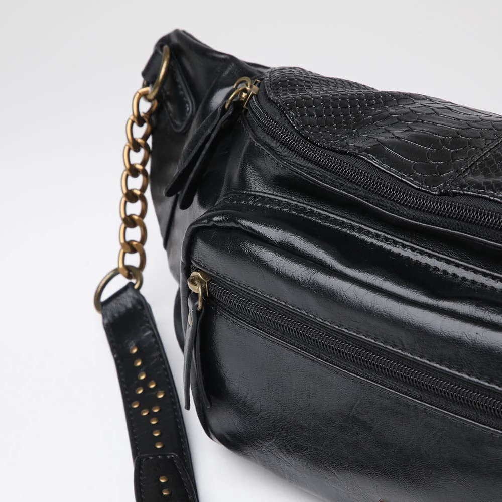 Banano Humana Ebro negro que pertenece a la colección Planetary Alignment. Banano de ecocuero combinado con correa de cadenas.