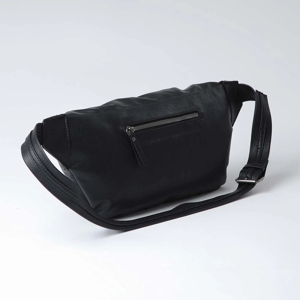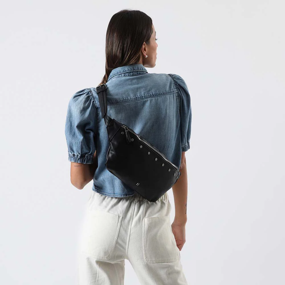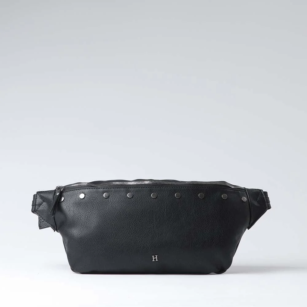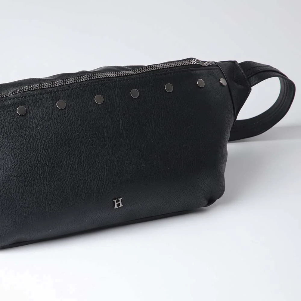 Banano Humana Line Up negro que pertenece a la colección Radiant Red. Banano de ecocuero con detalle de tachas.