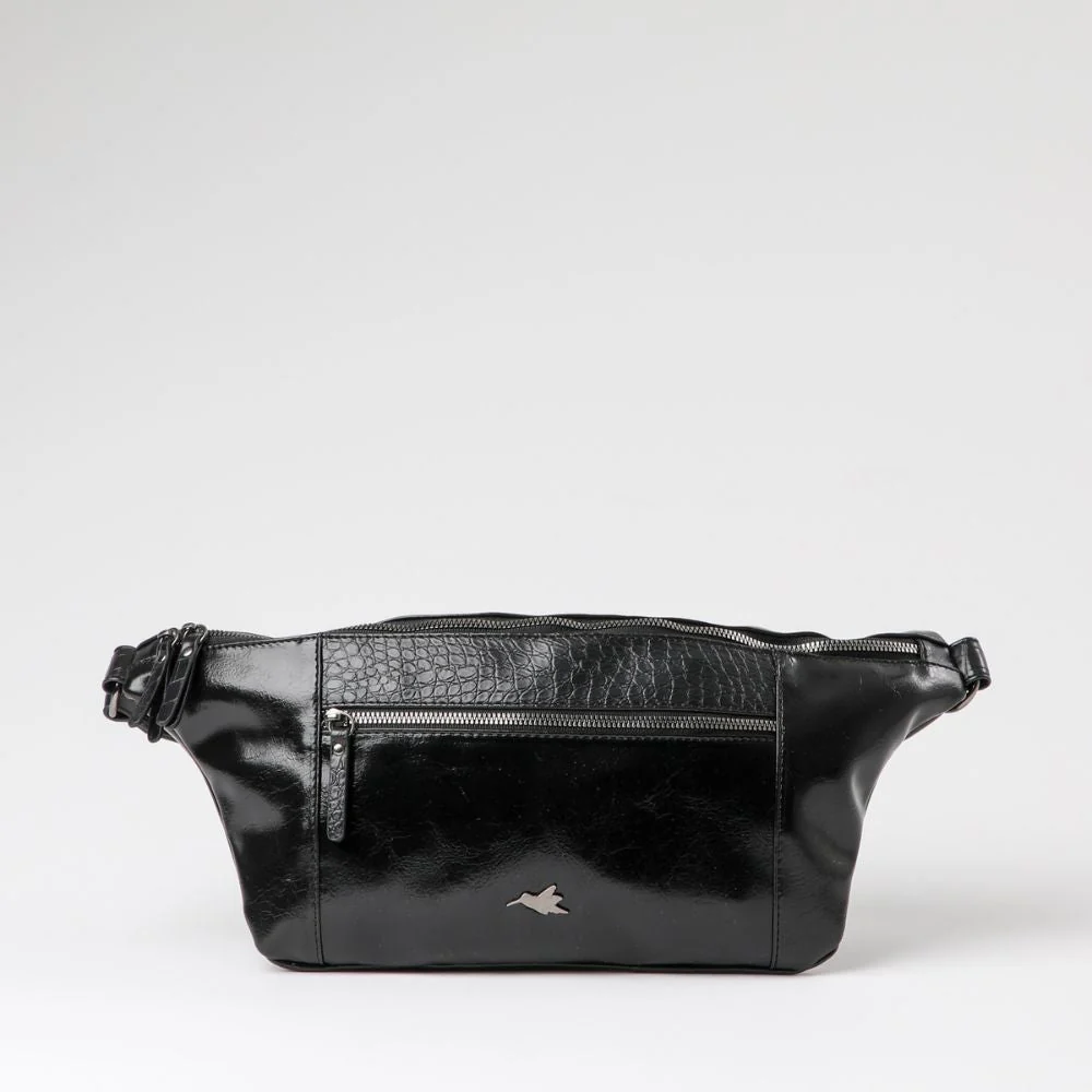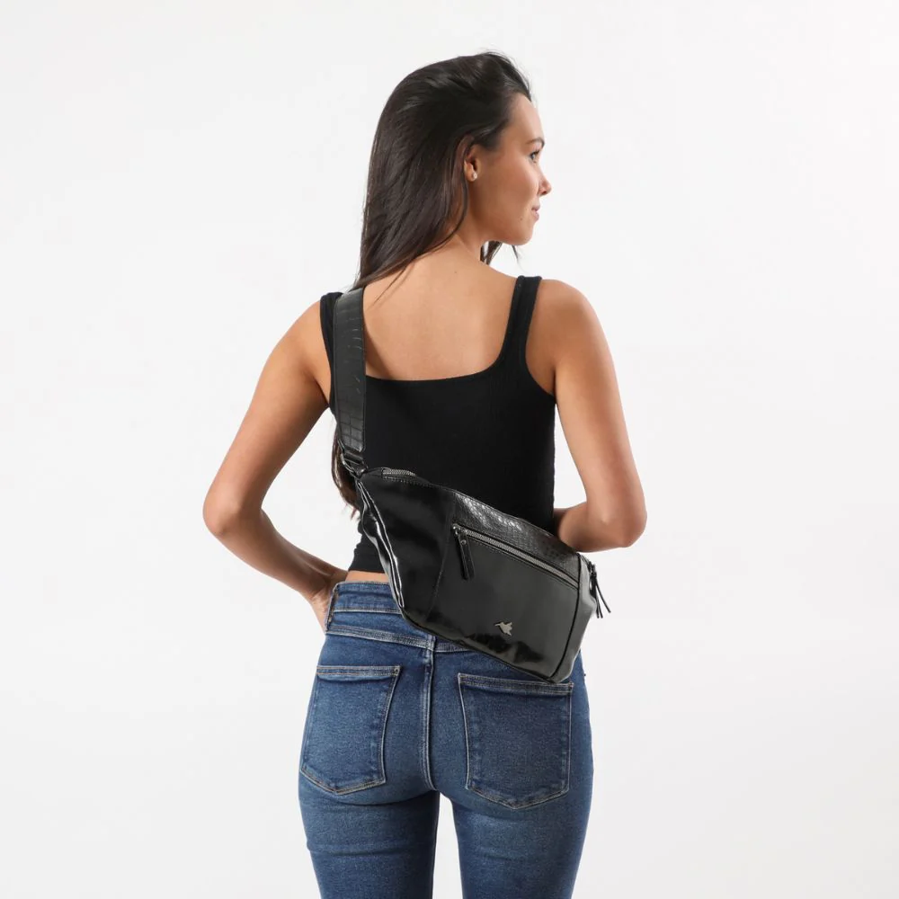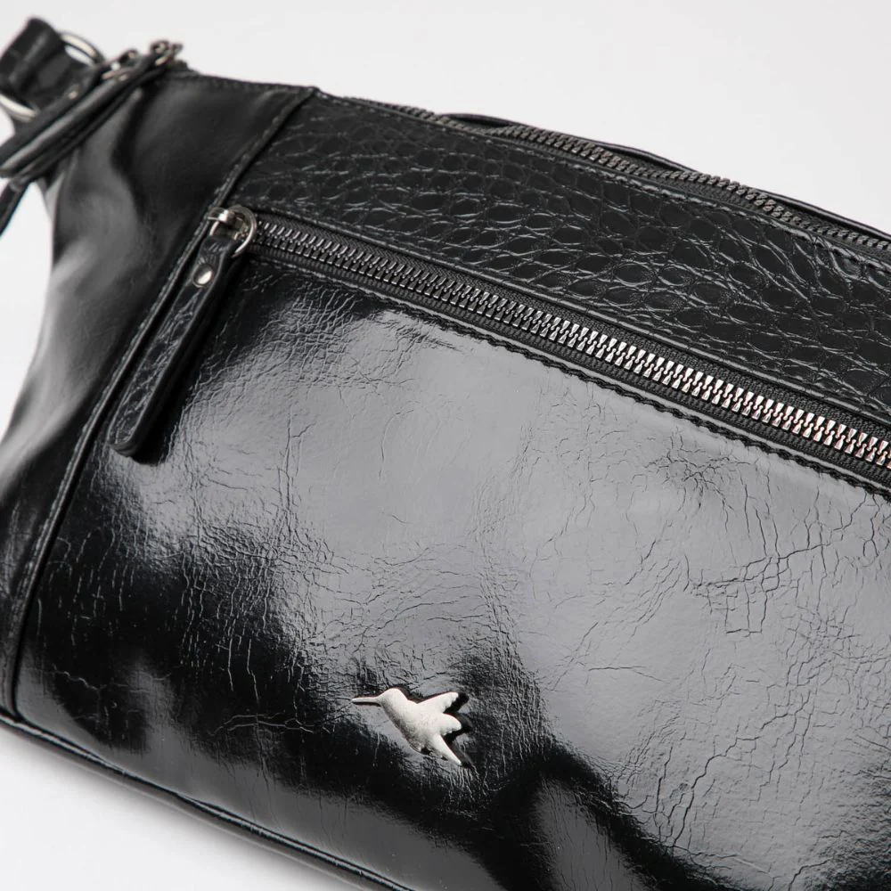 Es un banano de ecocuero acharolado negro simple, con una parte y la correa ajustable de textura croco. Cuenta con un bolsillo principal con cierre, dos bolsillos exteriores con cierre, uno en la parte delantera y el otro en la trasera. En su interior también tiene un bolsillo más pequeño con cierre y otro bolsillo abierto organizador. Los cierres, hebilla y logo exterior son de metal plateado oscuro.