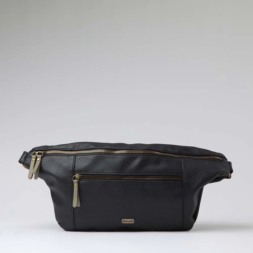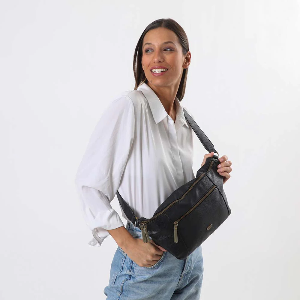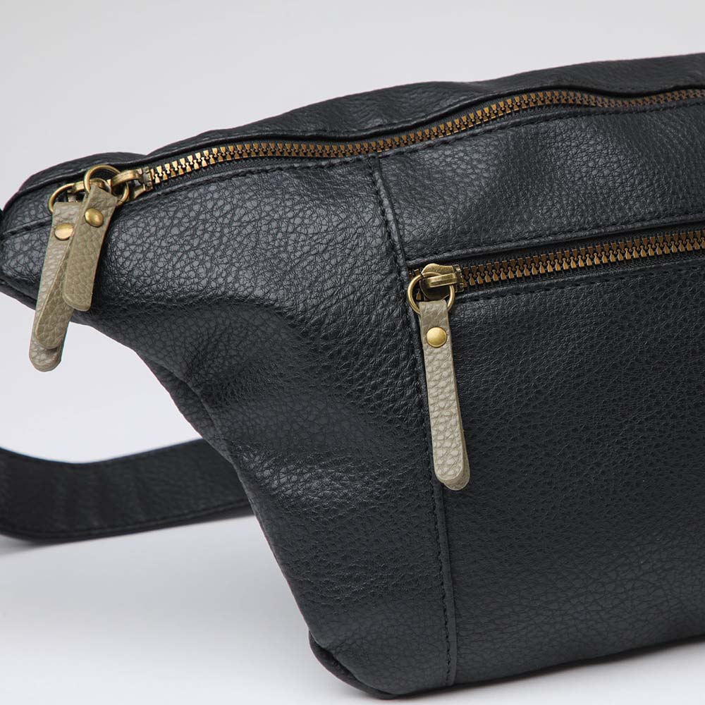 Banano Tatienne Theo Negro. Banano de ecocuero con detalles de color verde. Tiene bolsillos y correa ajustable.