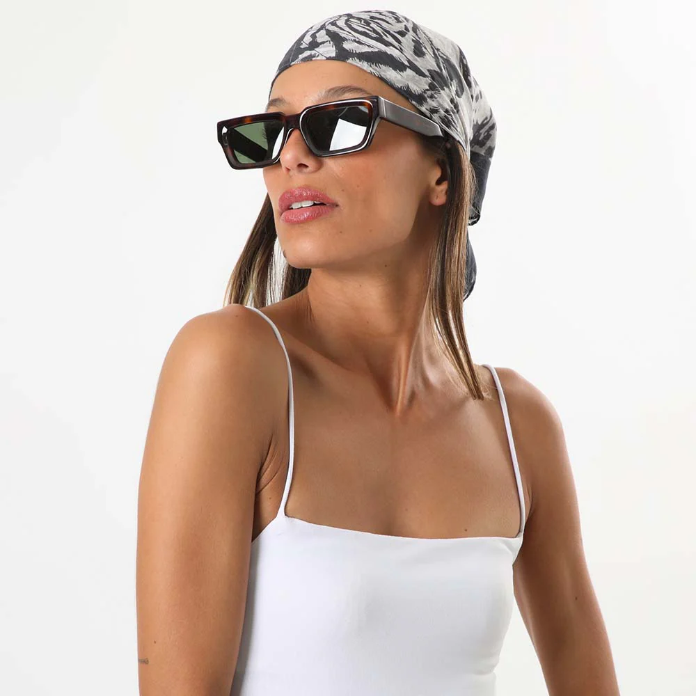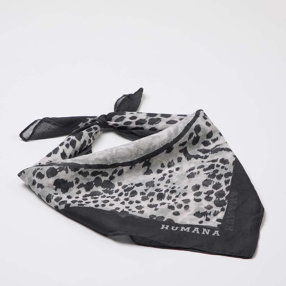Bandana Humana Balatius de color negro perteneciente a la colección Radiant Red. Su diseño es un estampado con un tigre al centro, rodeado de un print animal print y con un borde negro.