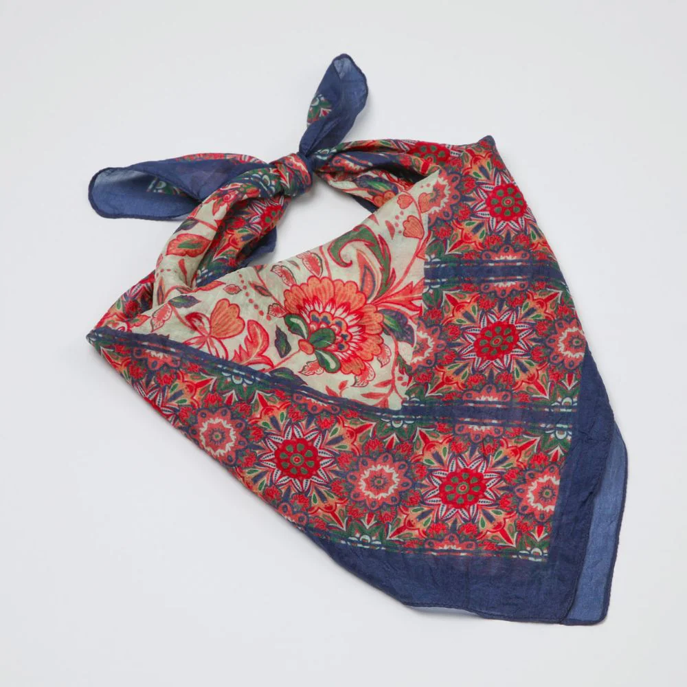 Bandana de seda rosada estampada con motivos florales con un marco en los bordes del pañuelo de color azul con terminaciones de costura lisa.