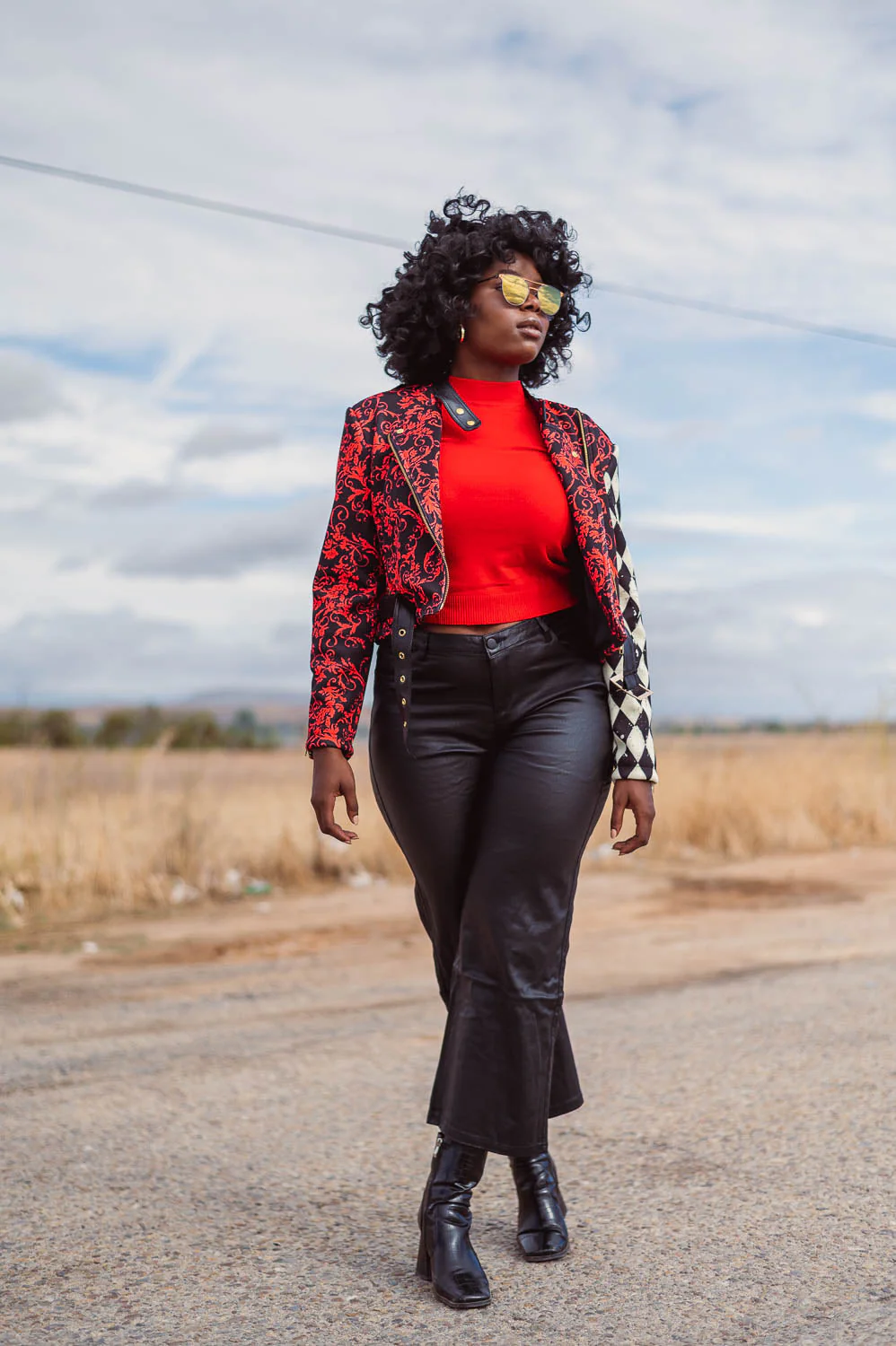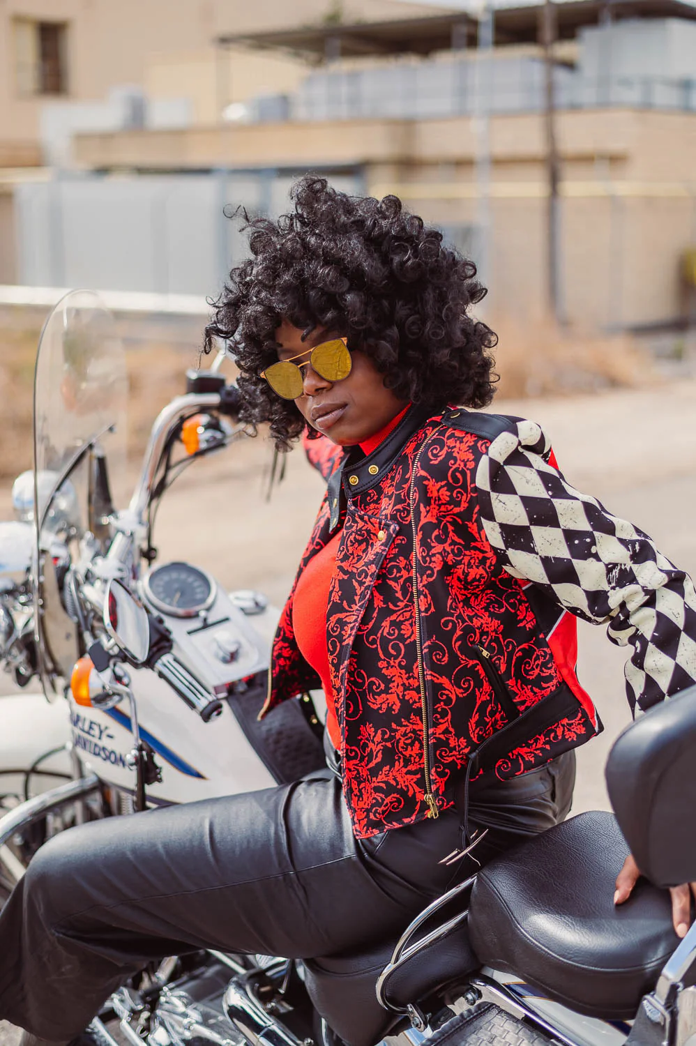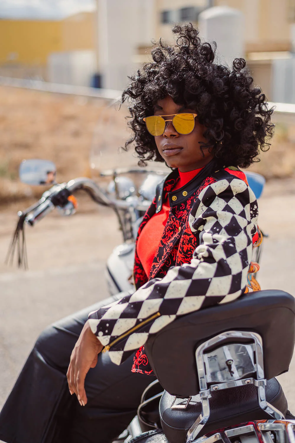 Biker de neopreno con estampado en la parte trasera de una escena de circo. Una de las mangas presenta estampado damero.