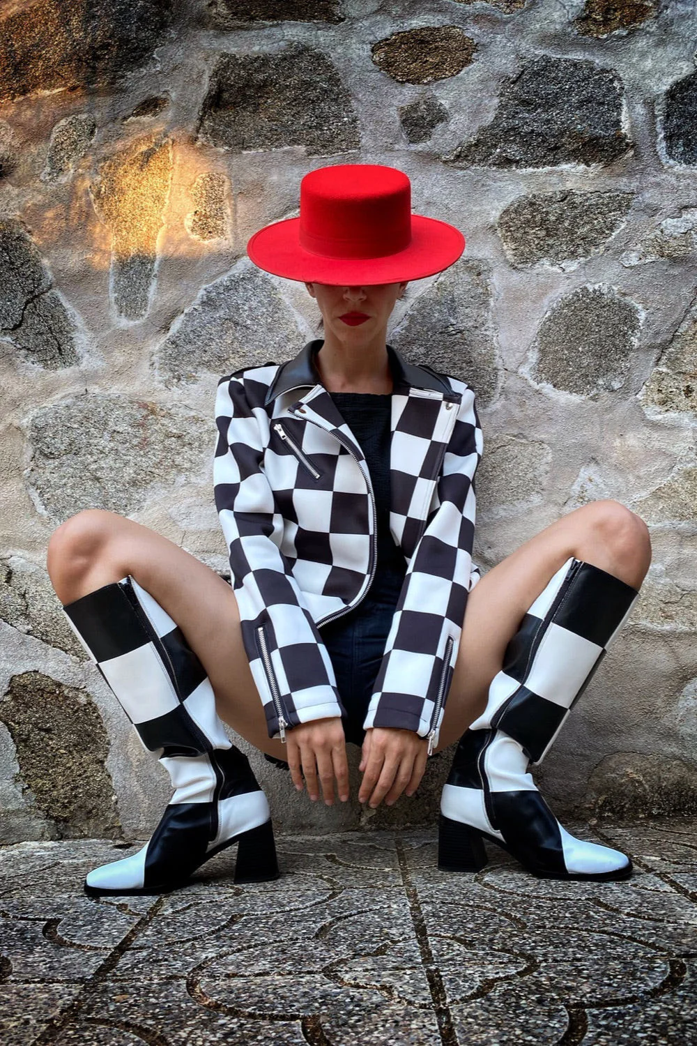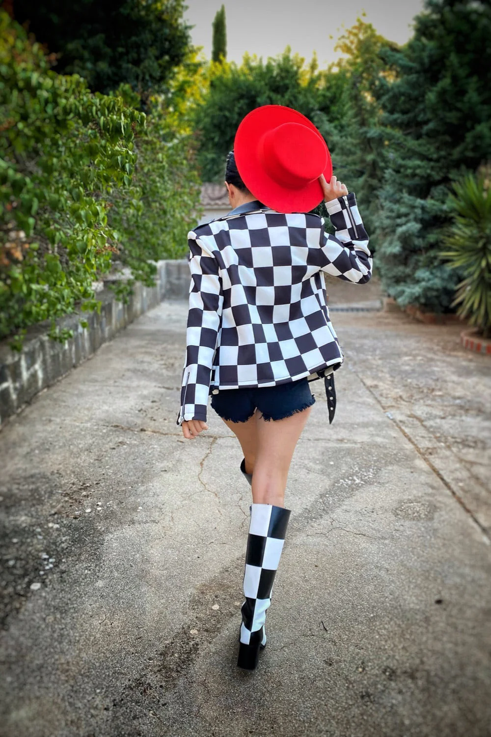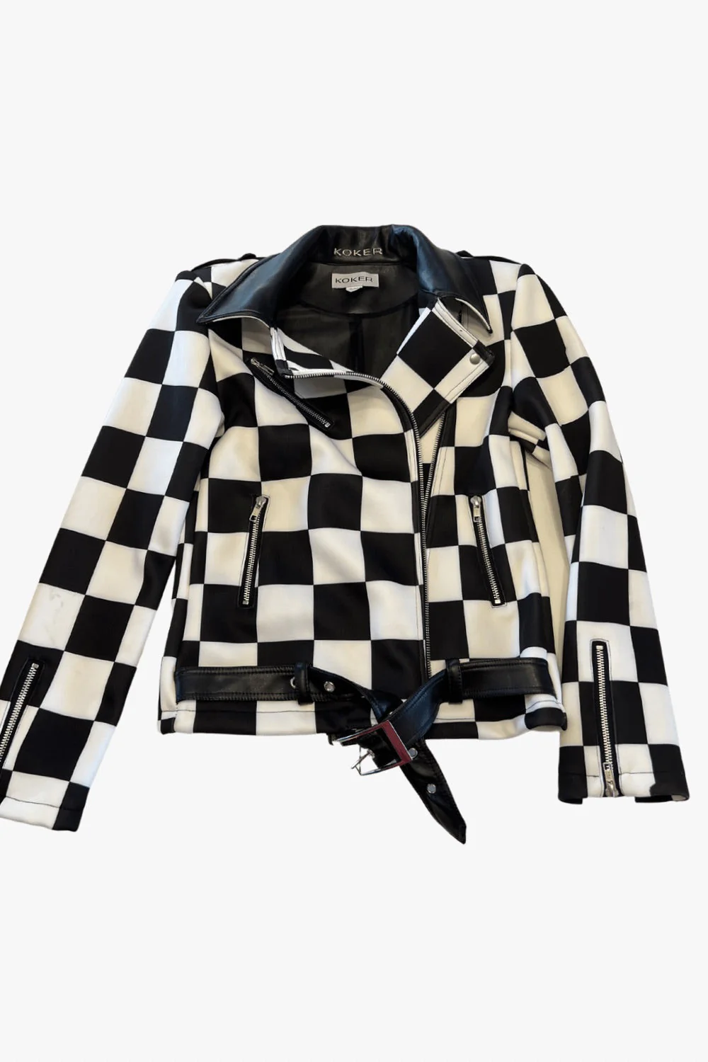 Biker de neopreno con estampado de cuadros blanco y negro, solapas y cinturón.