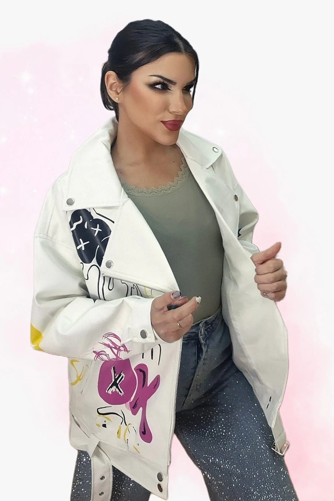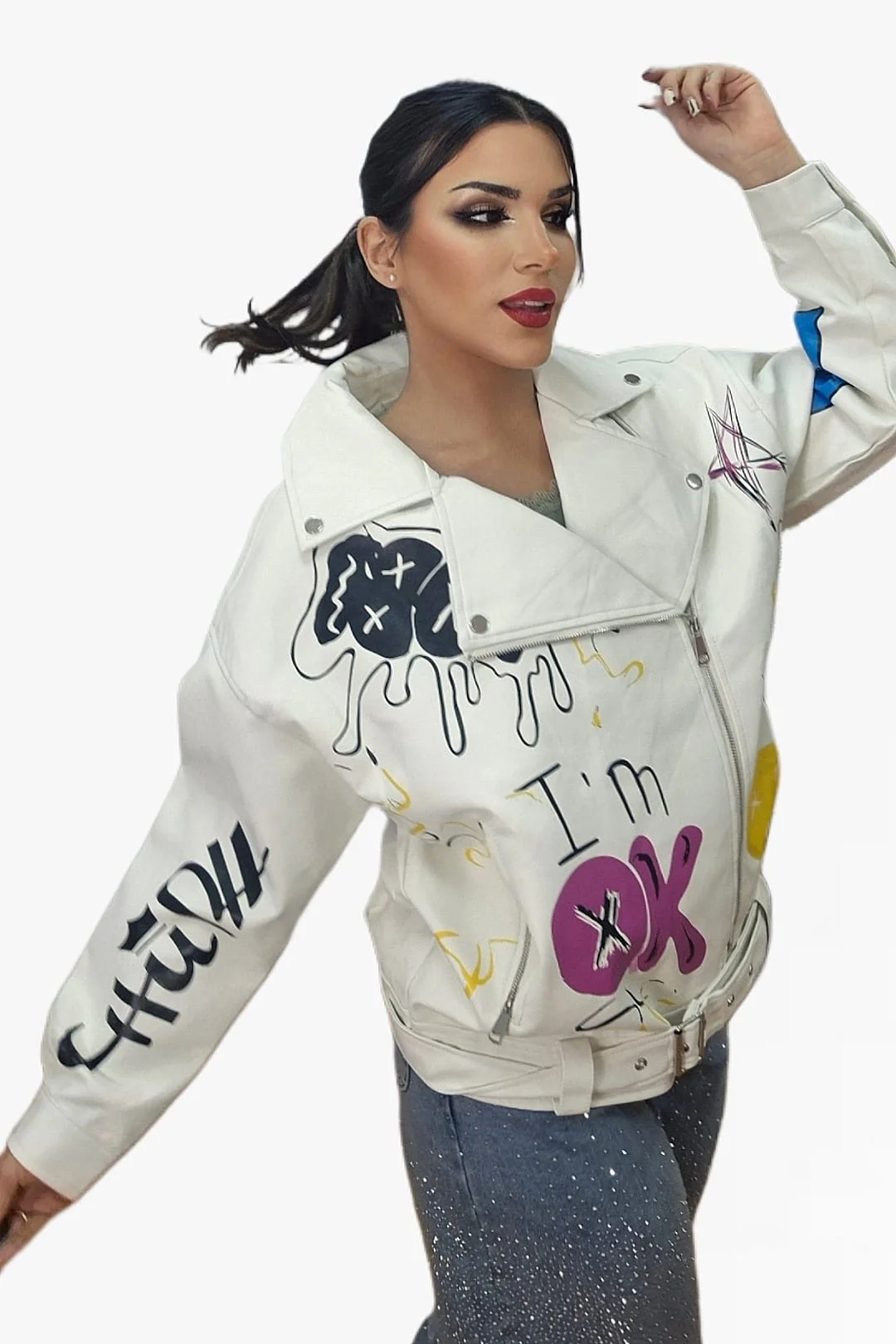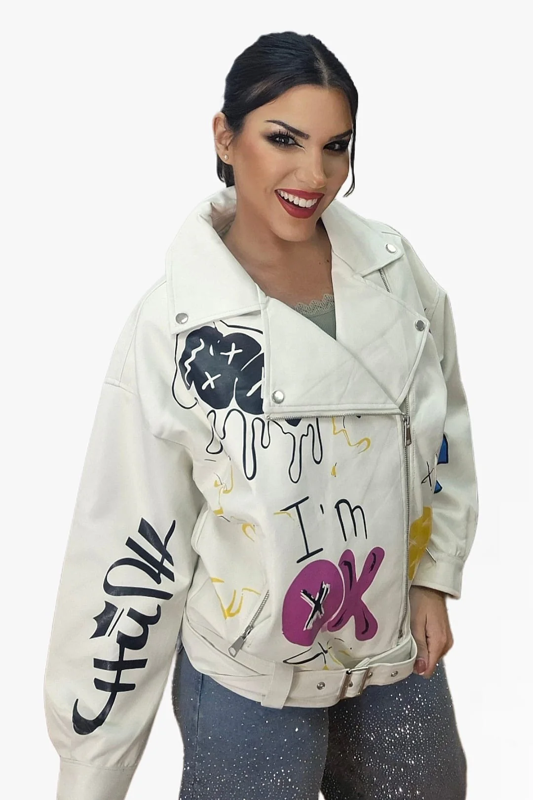 Rompe las reglas del estilo con esta biker oversize de inspiración urbana. Su diseño de hombro caído y corte amplio aporta un aire desenfadado y moderno, mientras que el estampado de graffitis le da un toque rebelde y artístico que no pasa desapercibido. Con bolsillos funcionales y disponible en dos colores, es la prenda perfecta para elevar cualquier look con actitud.