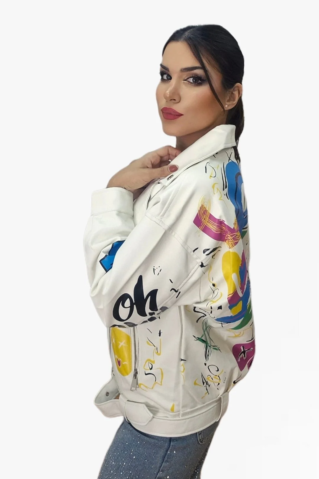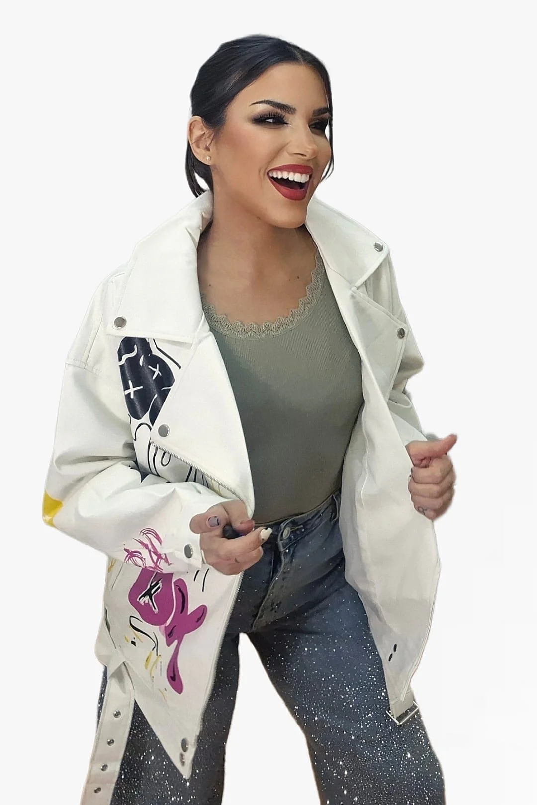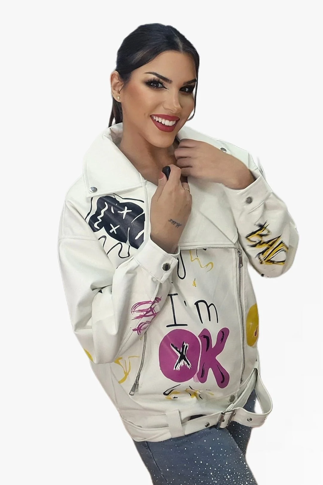 Rompe las reglas del estilo con esta biker oversize de inspiración urbana. Su diseño de hombro caído y corte amplio aporta un aire desenfadado y moderno, mientras que el estampado de graffitis le da un toque rebelde y artístico que no pasa desapercibido. Con bolsillos funcionales y disponible en dos colores, es la prenda perfecta para elevar cualquier look con actitud.
