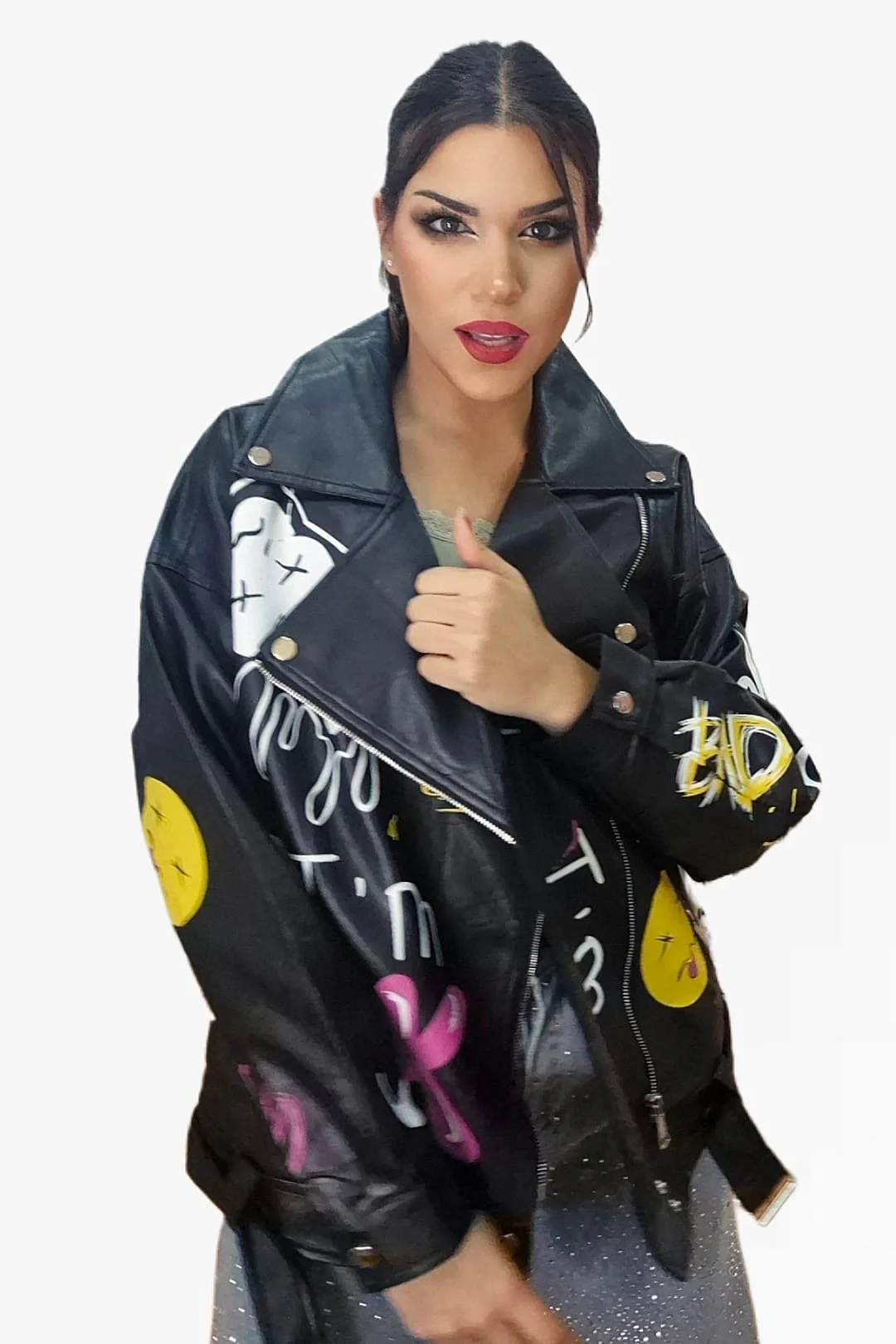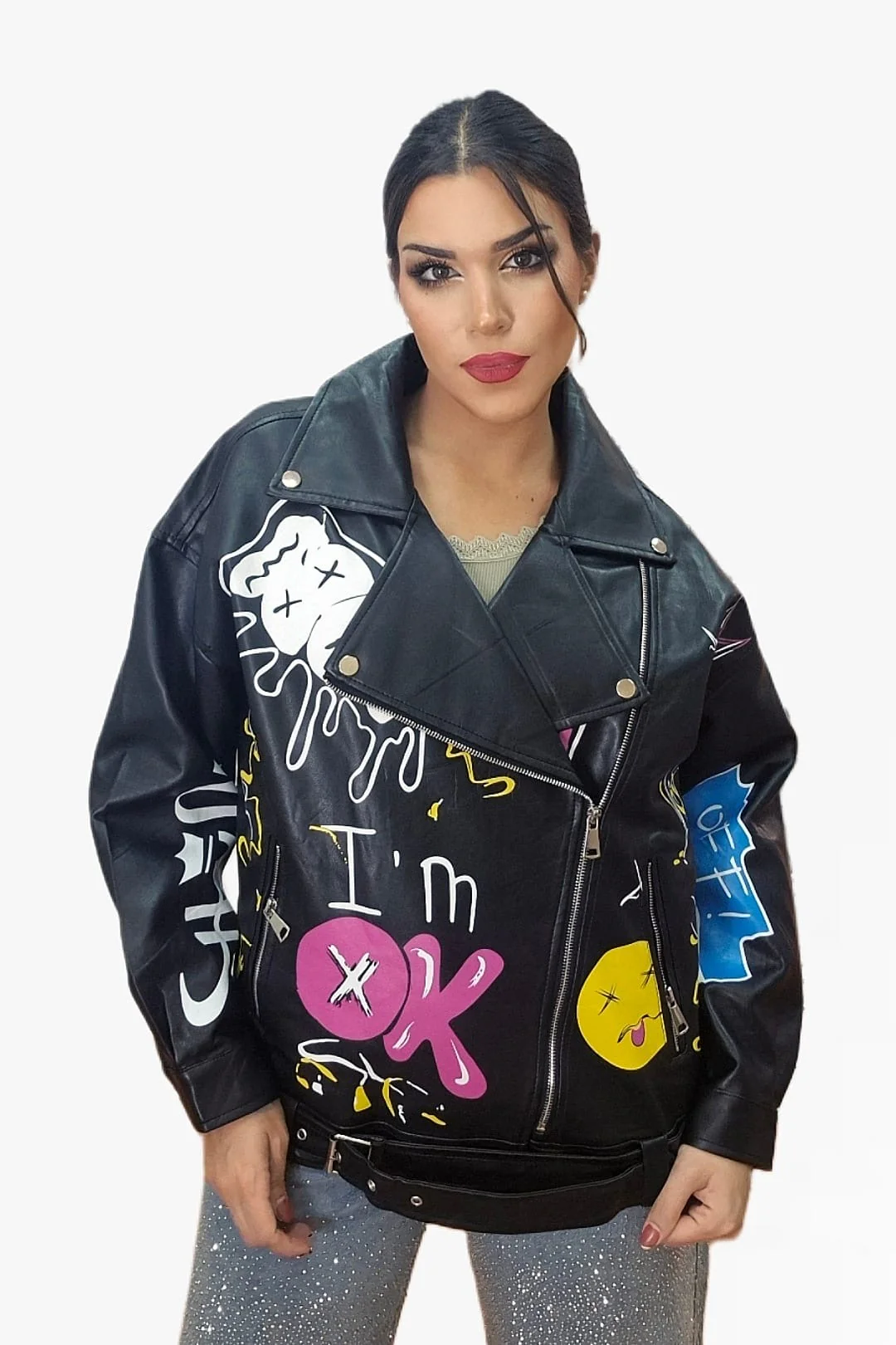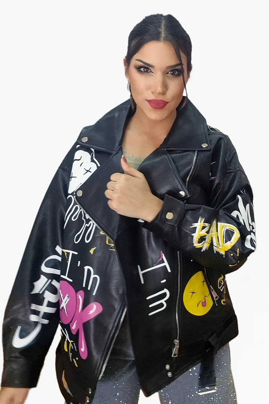 Rompe las reglas del estilo con esta biker oversize de inspiración urbana. Su diseño de hombro caído y corte amplio aporta un aire desenfadado y moderno, mientras que el estampado de graffitis le da un toque rebelde y artístico que no pasa desapercibido. Con bolsillos funcionales y disponible en dos colores, es la prenda perfecta para elevar cualquier look con actitud.