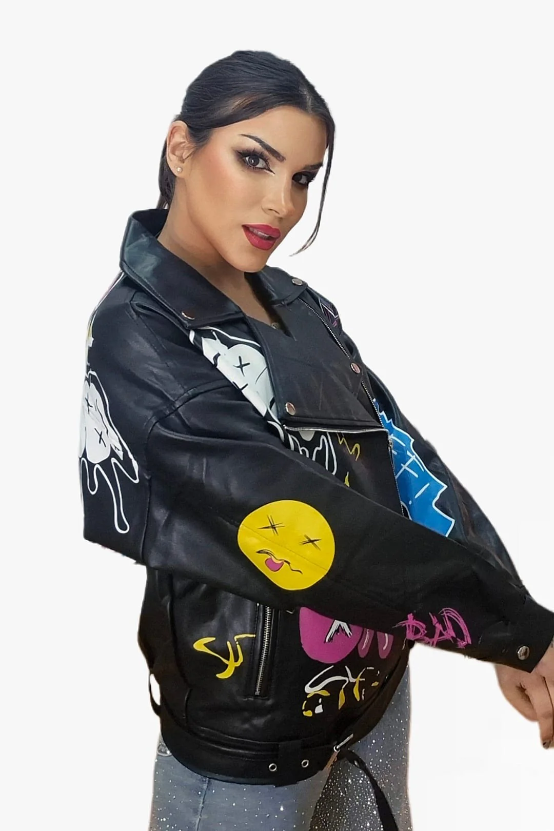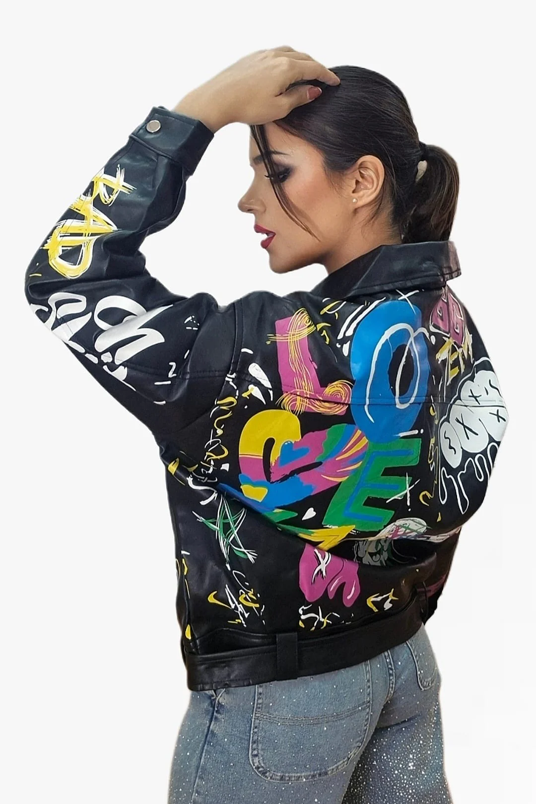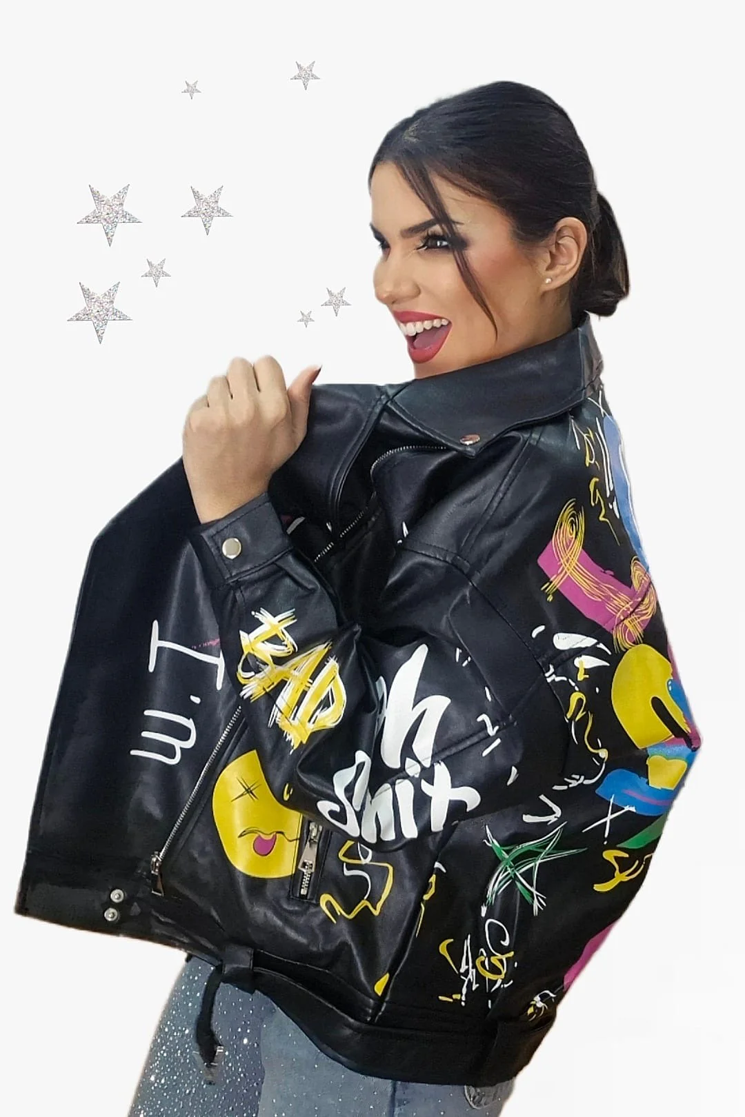 Rompe las reglas del estilo con esta biker oversize de inspiración urbana. Su diseño de hombro caído y corte amplio aporta un aire desenfadado y moderno, mientras que el estampado de graffitis le da un toque rebelde y artístico que no pasa desapercibido. Con bolsillos funcionales y disponible en dos colores, es la prenda perfecta para elevar cualquier look con actitud.