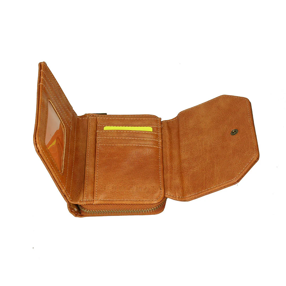 Billetera Humana Studs chica de color café. Tiene dos compartimientos: uno con broche con tarjetero y otro con cierre. EL bolsillo principal tiene detalle con tachas doradas.