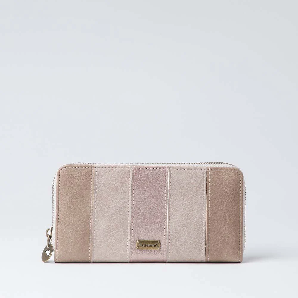 Billetera Grande Tatienne Field de color rosado. Billetera con bolsillo principal con cierre, cuenta con monedero y tarjetero interior. Tiene un diseño de lineas de ecocuero y género en diferentes tonos beige cálidos.