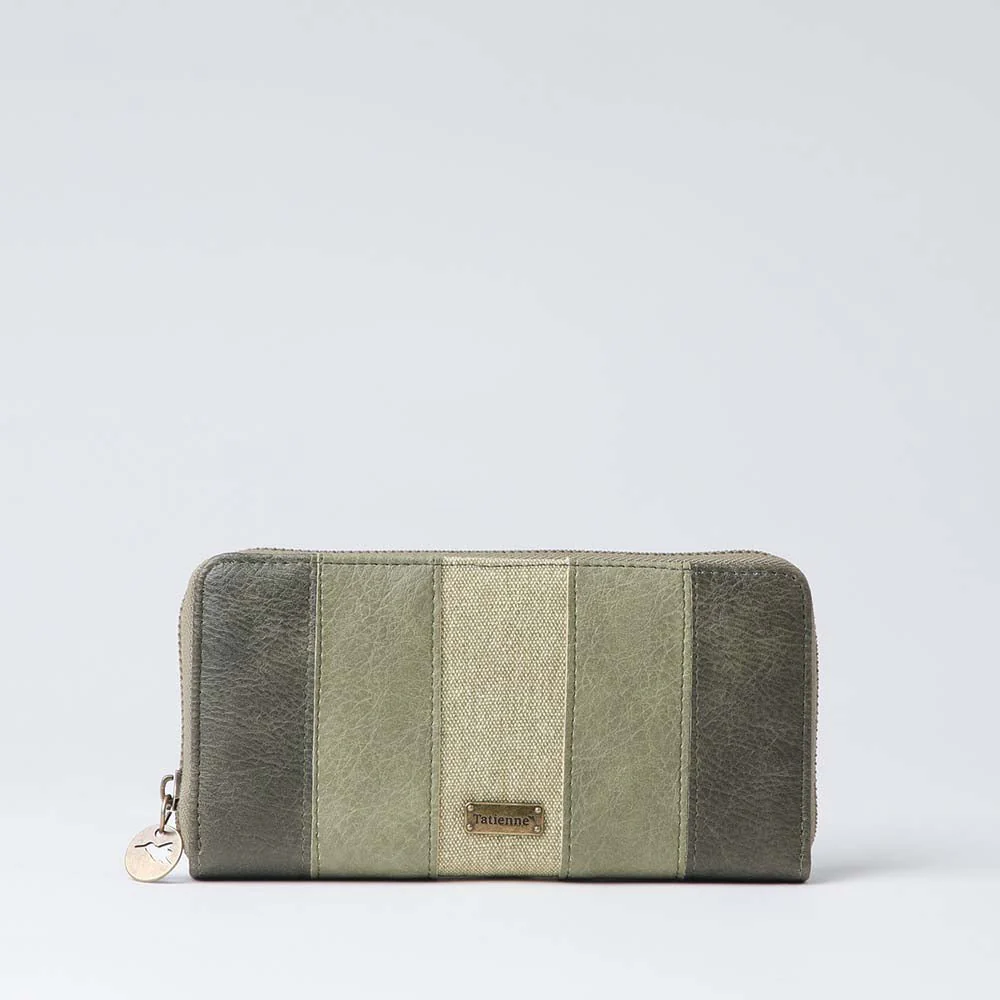 Billetera Grande Tatienne Field de color verde. Billetera con bolsillo principal con cierre, cuenta con monedero y tarjetero interior. Tiene un diseño de lineas de ecocuero y género en diferentes tonos de verde.