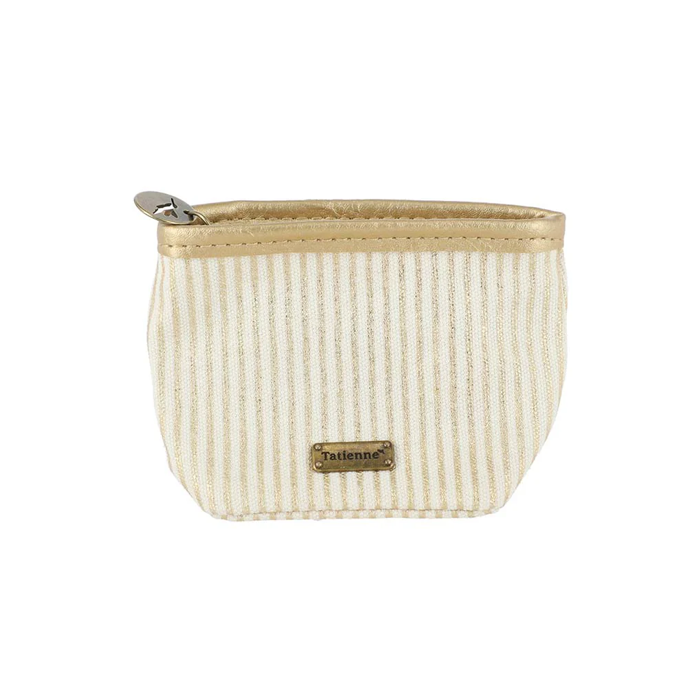 Billetera Tatienne Raya Dorada Monedero. Compuesto por un fondo beige con lineas doradas
